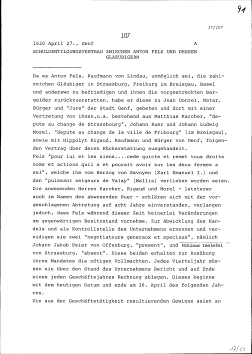 Schuldentilgungsvertrag zwischen Anton Fels und dessen Gläubigen