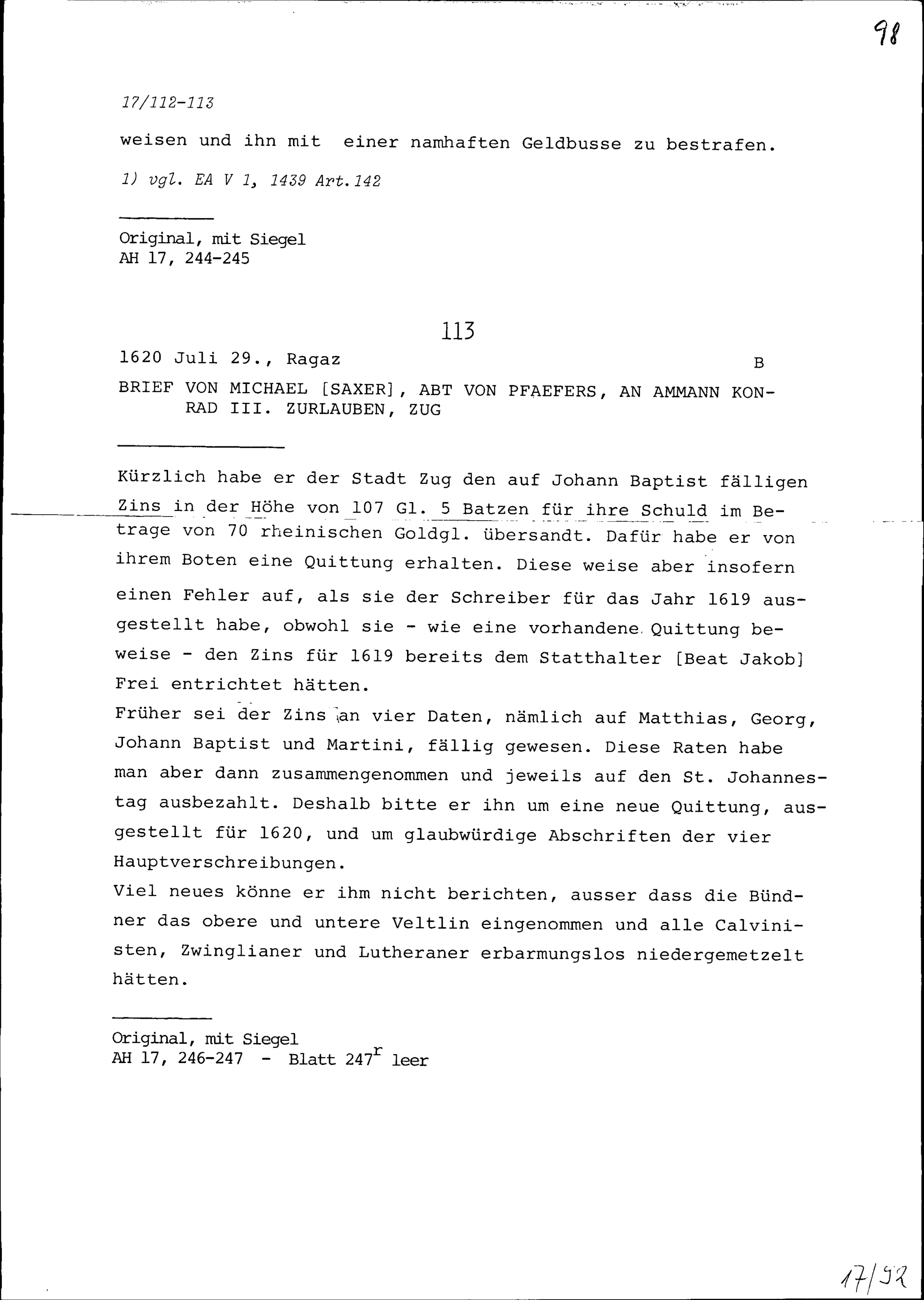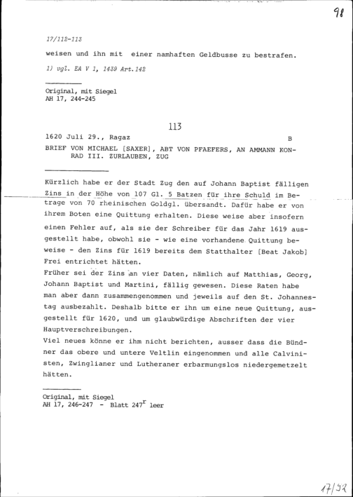 Schreiben von Michael Saxer, Abt von Pfäfers, an Konrad III. Zurlauben, Ammann, Zug