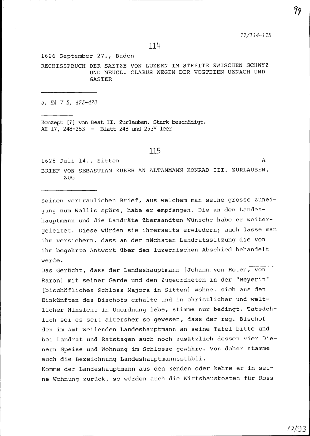 Rechtsspruch der Sätze von Luzern im Streit zwischen Schwyz und Neugläubig Glarus wegen der Vogteien Uznach und Gaster