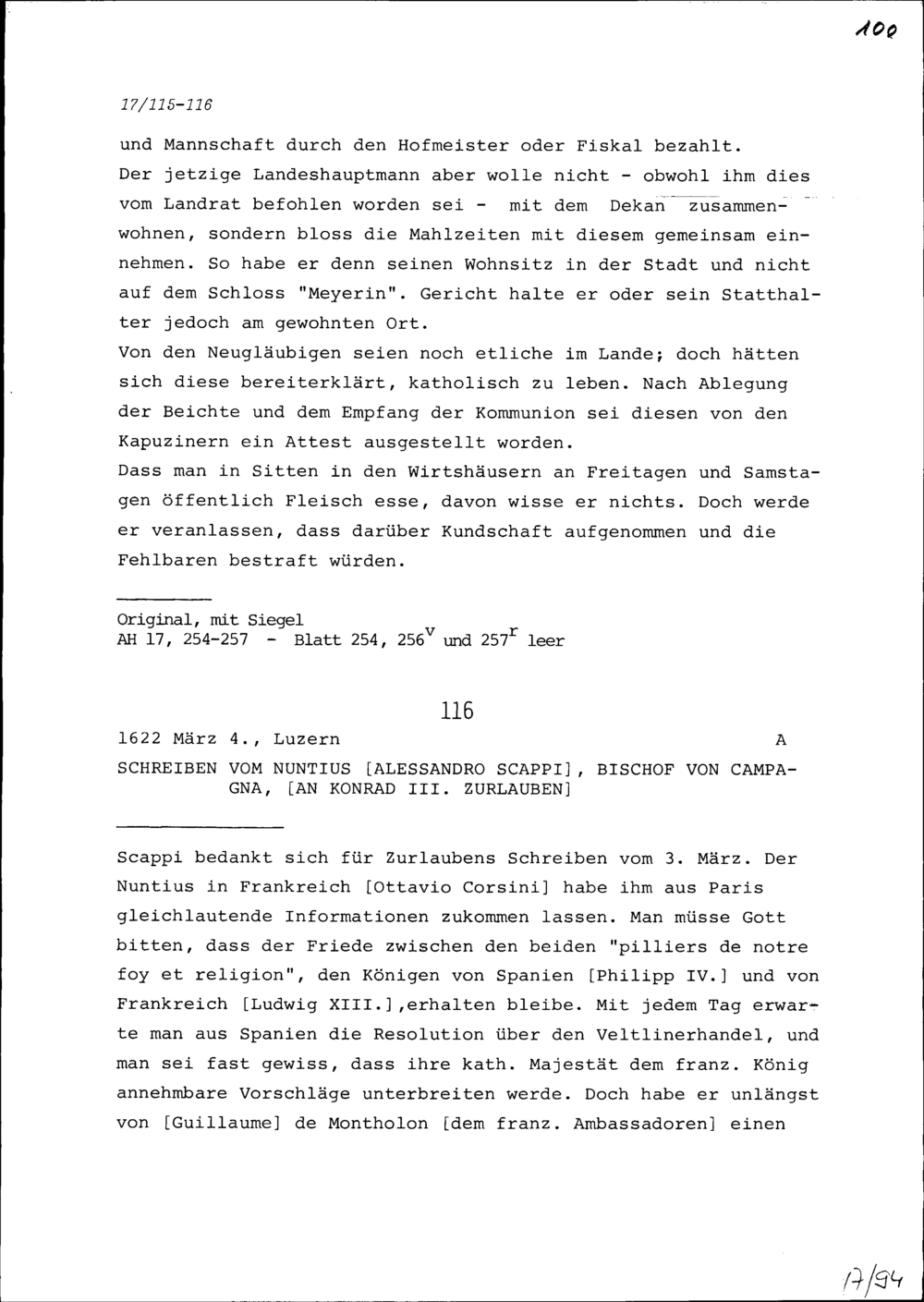 Schreiben von Alessandro Scappi, Nuntius und Bischof von Campagna, an Konrad III. Zurlauben