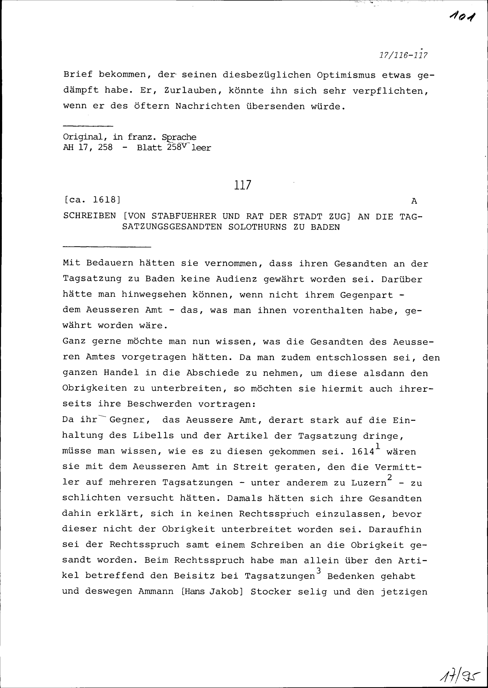 Schreiben des Stabführers und Rats der Stadt Zug an die Tagsatzungsgesandten Solothurns...