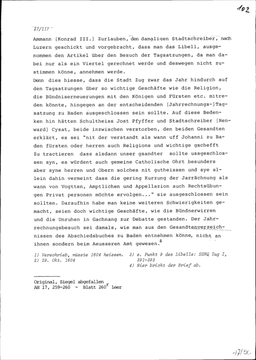 Schreiben des Stabführers und Rats der Stadt Zug an die Tagsatzungsgesandten Solothurns...