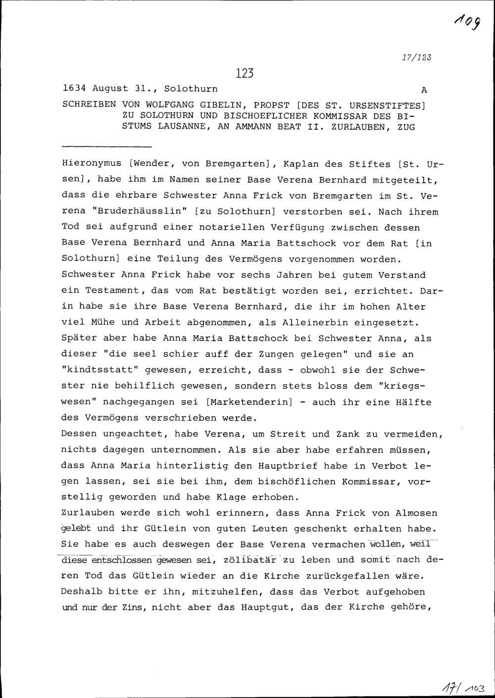 Schreiben von Wolfgang Gibelin, Propst des Sankt Ursenstifts zu Solothurn und bischöflicher Kommissar des Bistums Lausanne, an Beat II. Zurlauben, Ammann, Zug