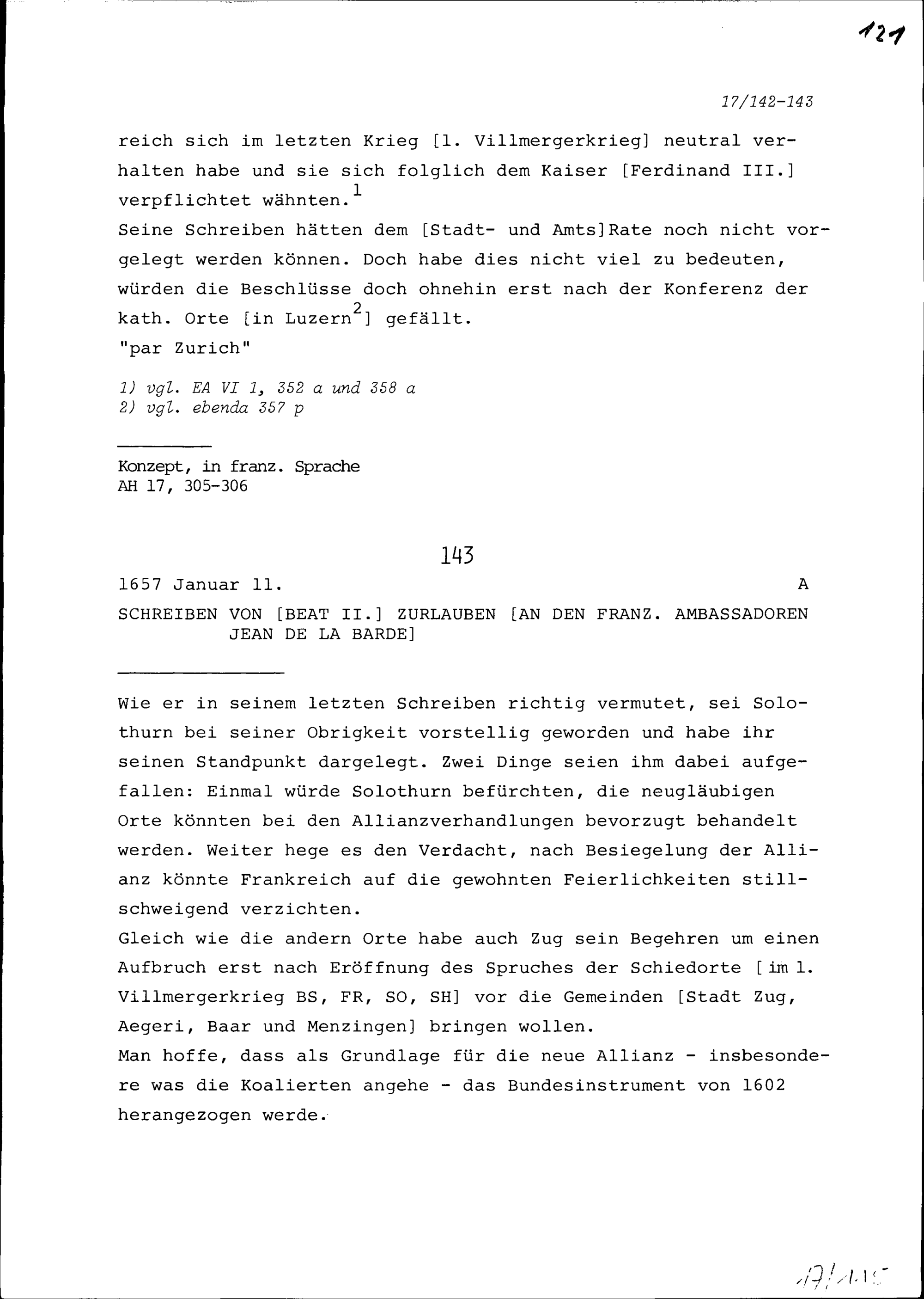 Schreiben von Beat II. Zurlauben an Jean de la Barde, Ambassador von Frankreich