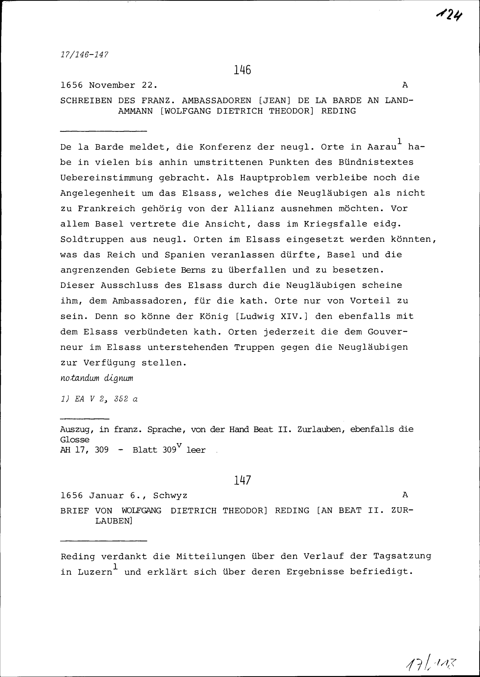 Schreiben von Jean de la Barde, Ambassador von Frankreich, an Wolfgang Dietrich Theodor Reding, Landammann