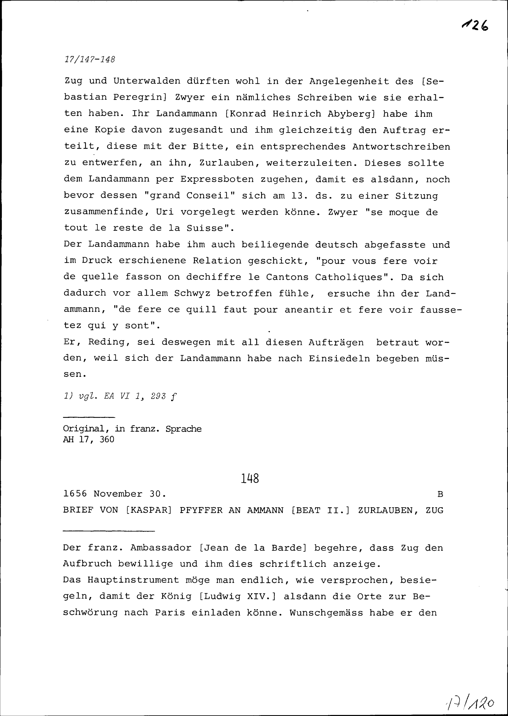 Schreiben von Kaspar Pfyffer an Beat II. Zurlauben, Ammann, Zug