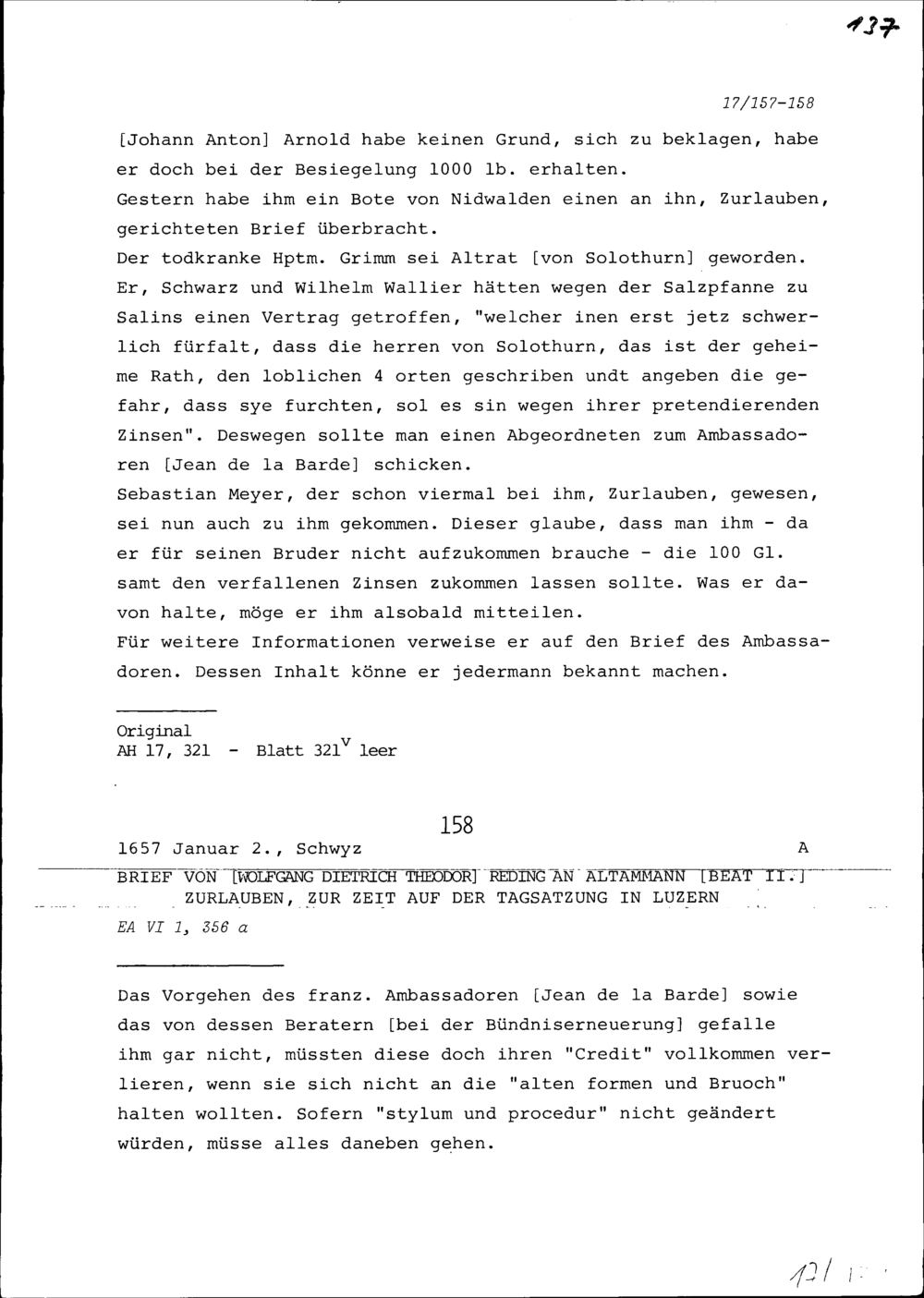 Schreiben von Wolfgang Dietrich Theodor Reding an Beat II. Zurlauben, Altammann,...