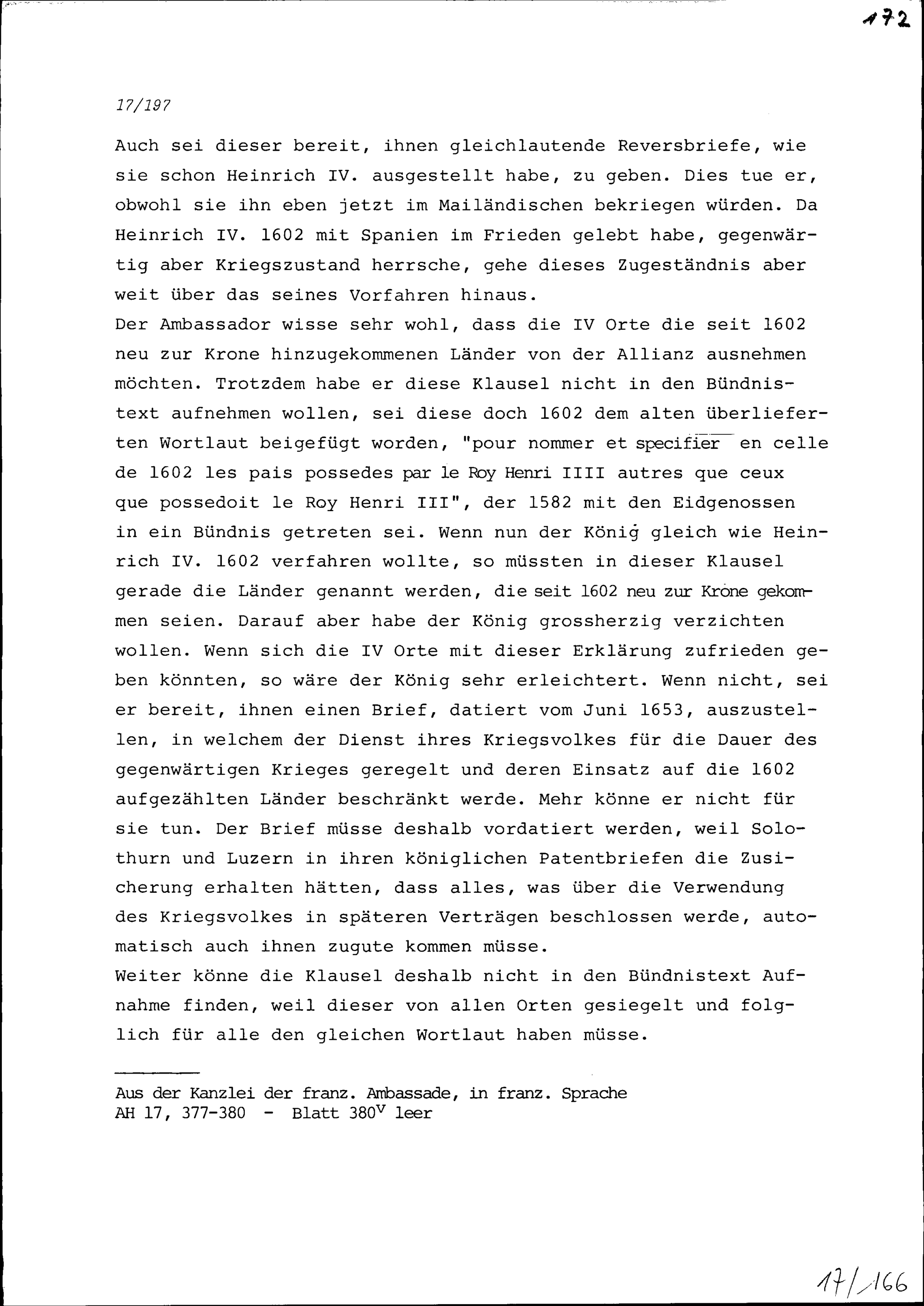 Vorschläge von Jean de la Barde, Ambassador von Frankreich, an die Gesandten der Vier Katholischen Orte Uri, Schwyz, Unterwalden (Ob- und Nidwalden) und Zug in Brunnen