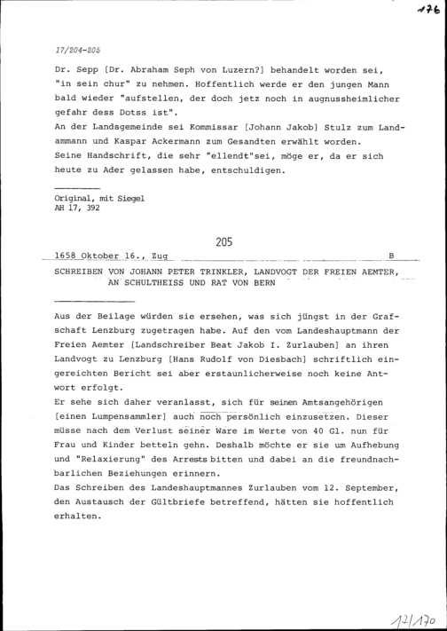 Schreiben von Johann Peter Trinkler, Landvogt der Freien Ämter, an Schultheiss und Rat Bern