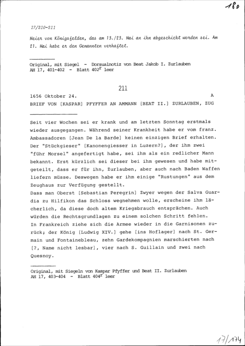 Schreiben von Kaspar Pfyffer an Beat II. Zurlauben, Ammann, Zug