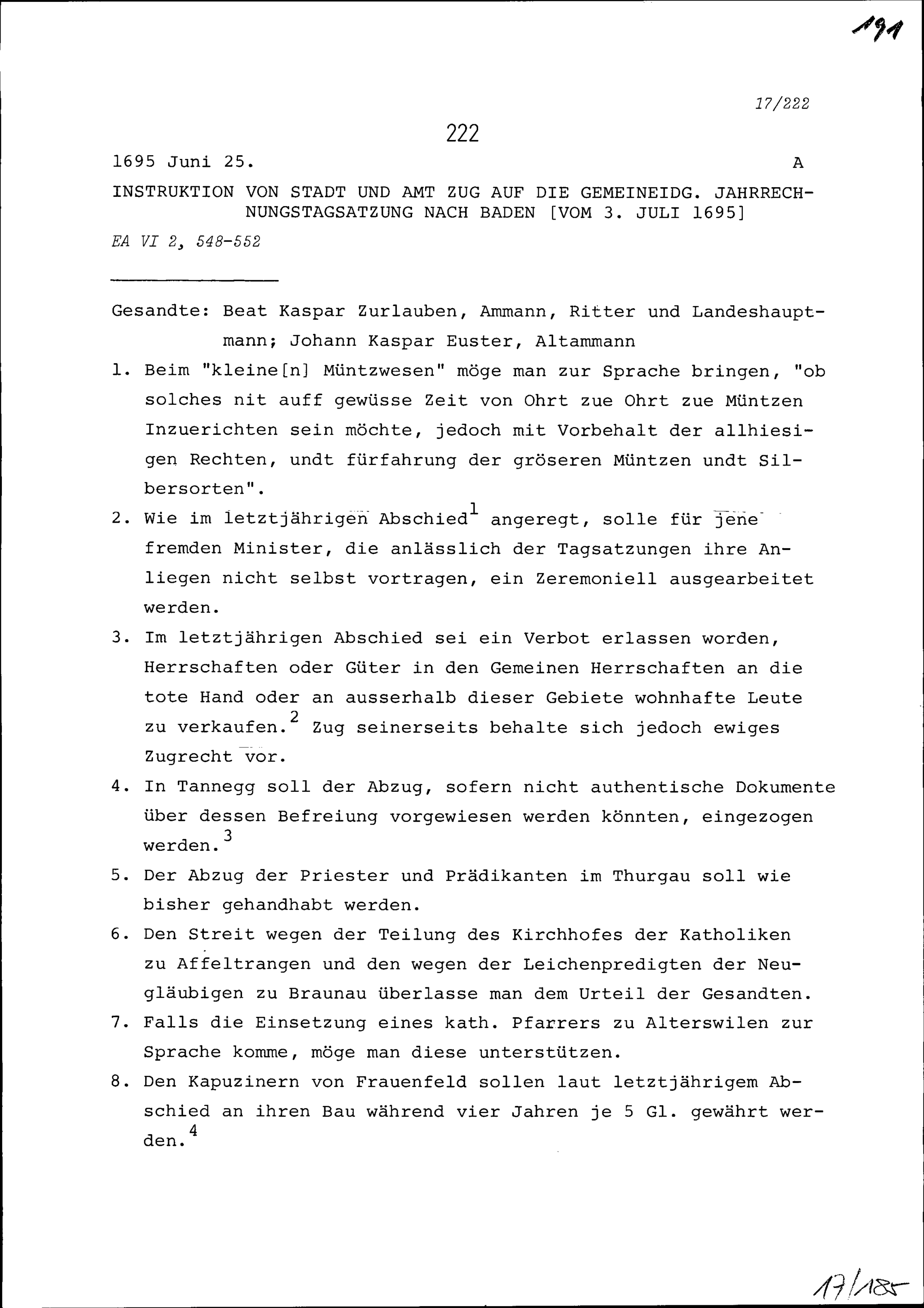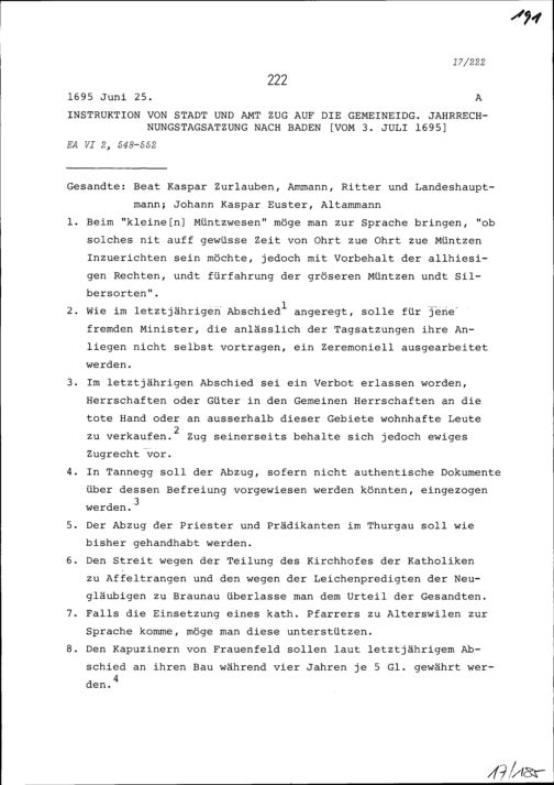 Instruktion von Stadt und Amt Zug auf die Jahrrechnung in Baden vom 3. Juli 1695