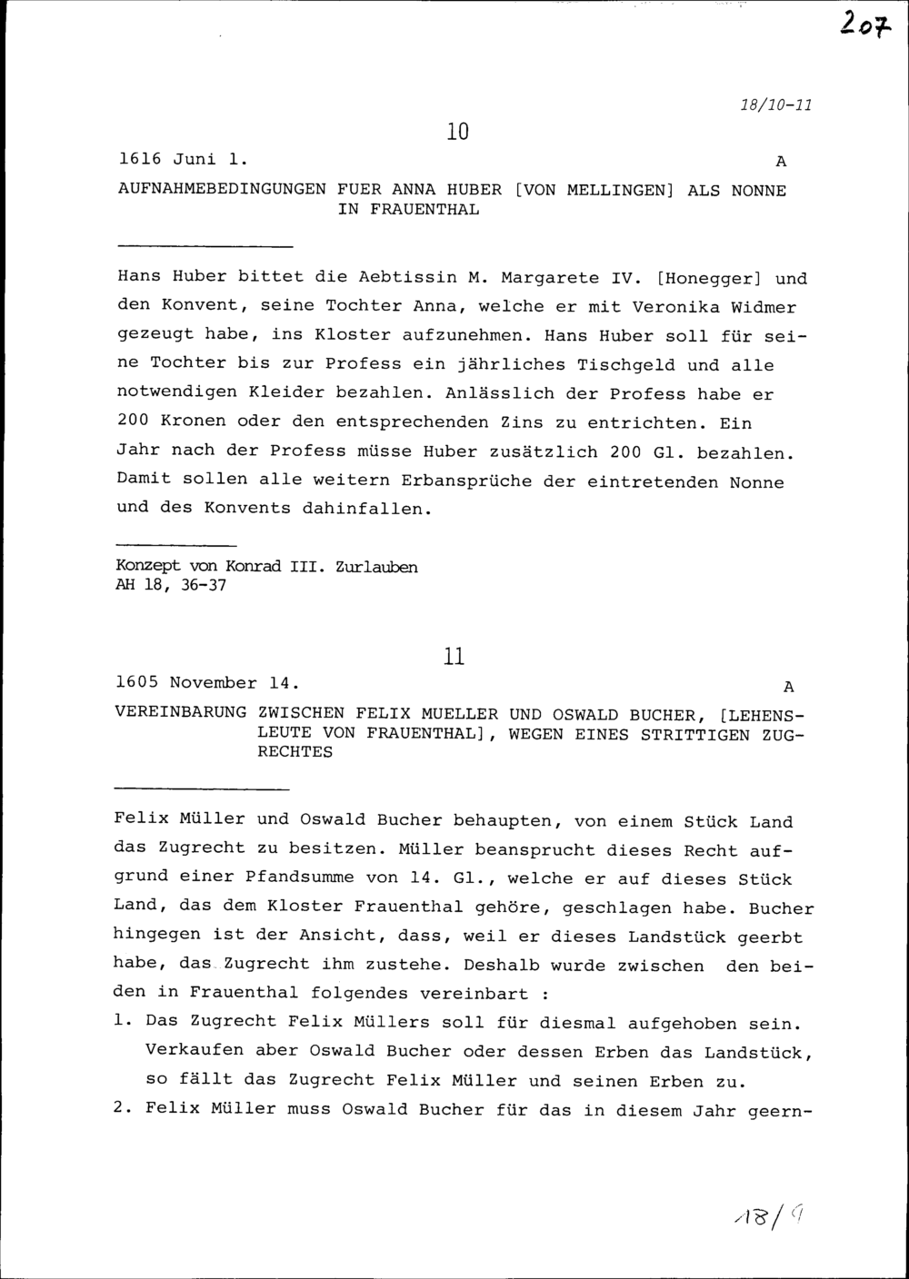 Aufnahmebedingungen für Anna Huber von Mellingen als Klosterfrau im Frauenkloster Frauenthal
