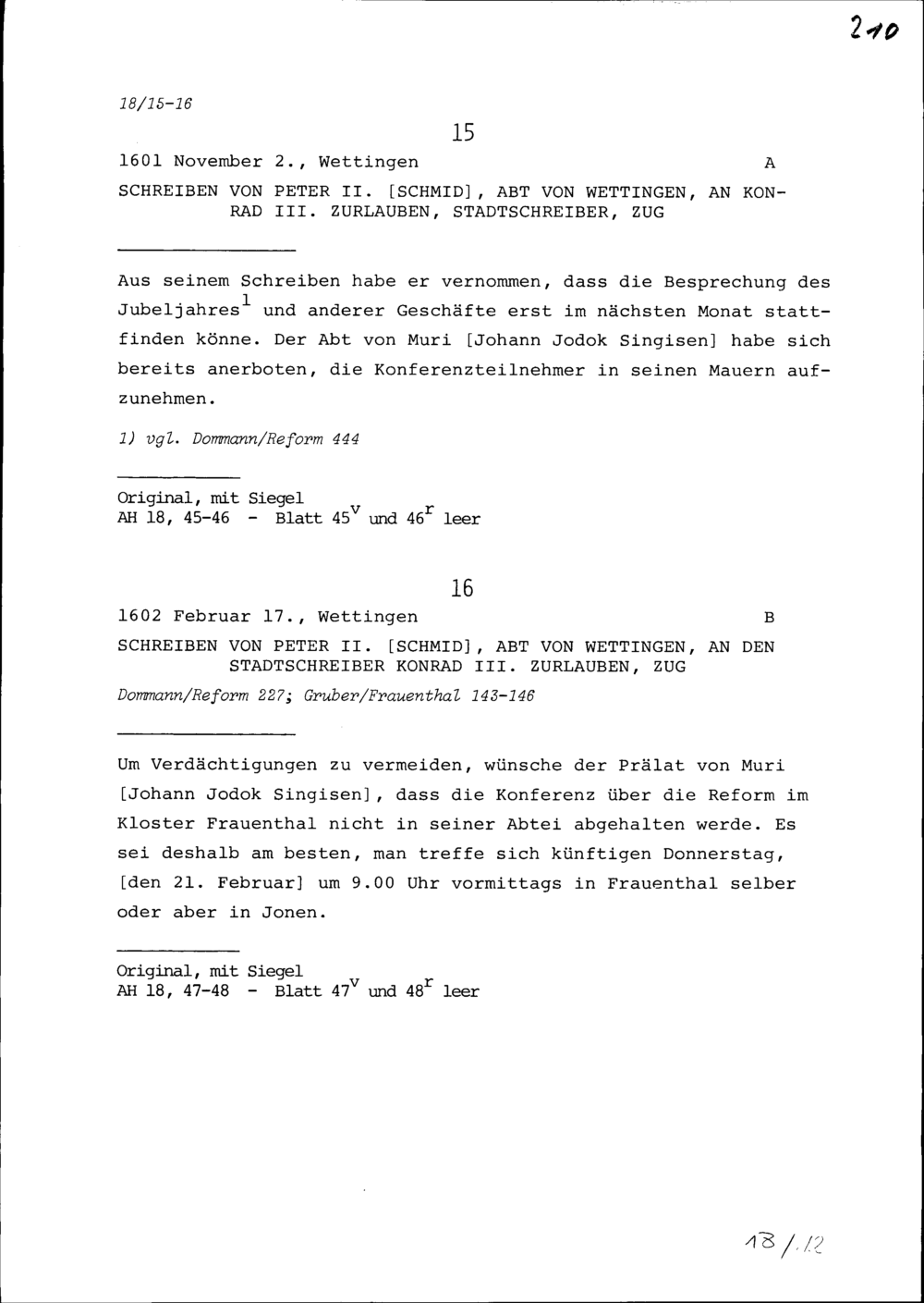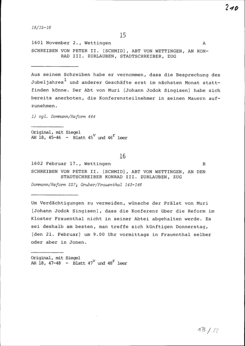 Schreiben von Peter II. Schmid, Abt von Wettingen, an Konrad III. Zurlauben, Stadtschreiber, Zug