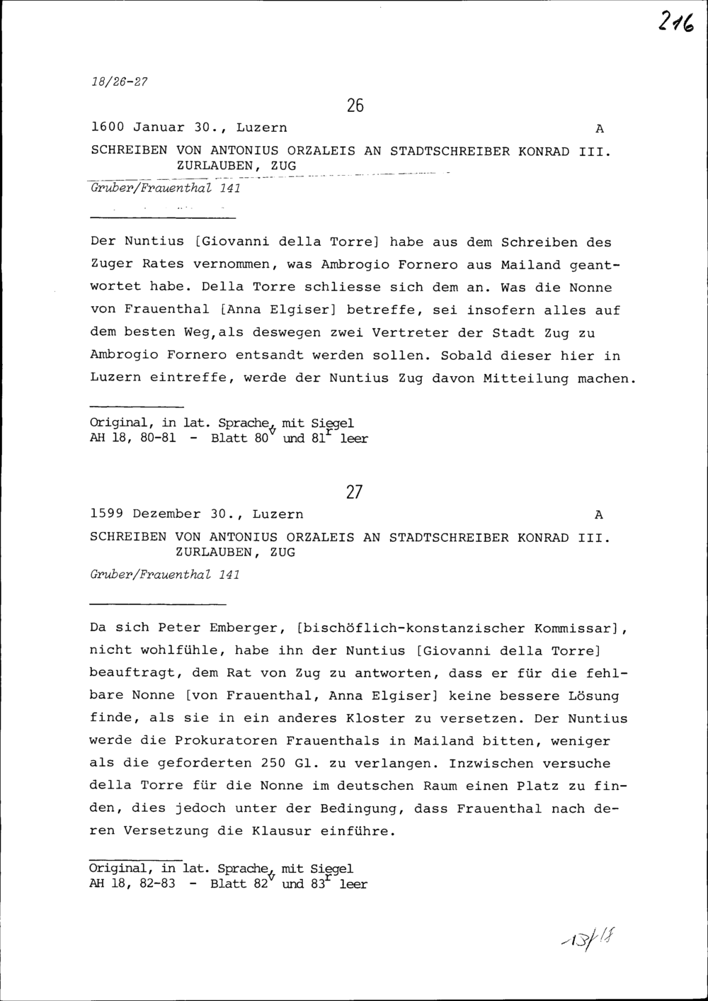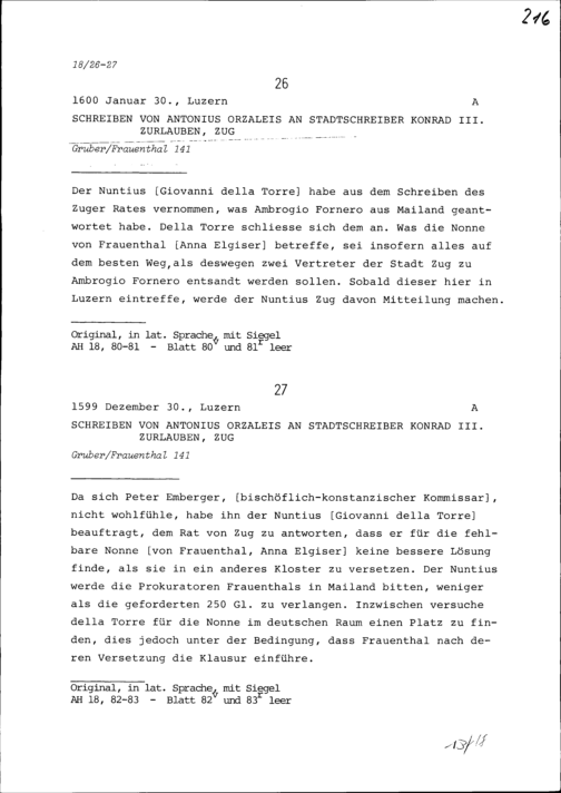 Schreiben von Antonius Orzaleis an Konrad III. Zurlauben, Stadtschreiber, Zug