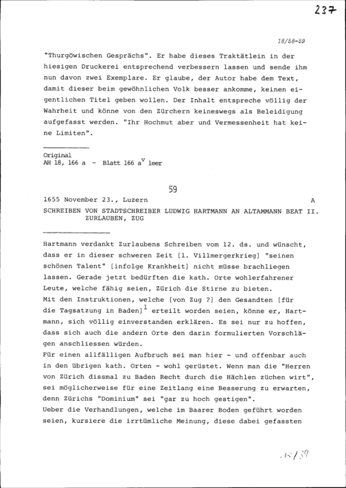 Schreiben von Ludwig Hartmann, Stadtschreiber, an Beat II. Zurlauben, Altammann, Zug