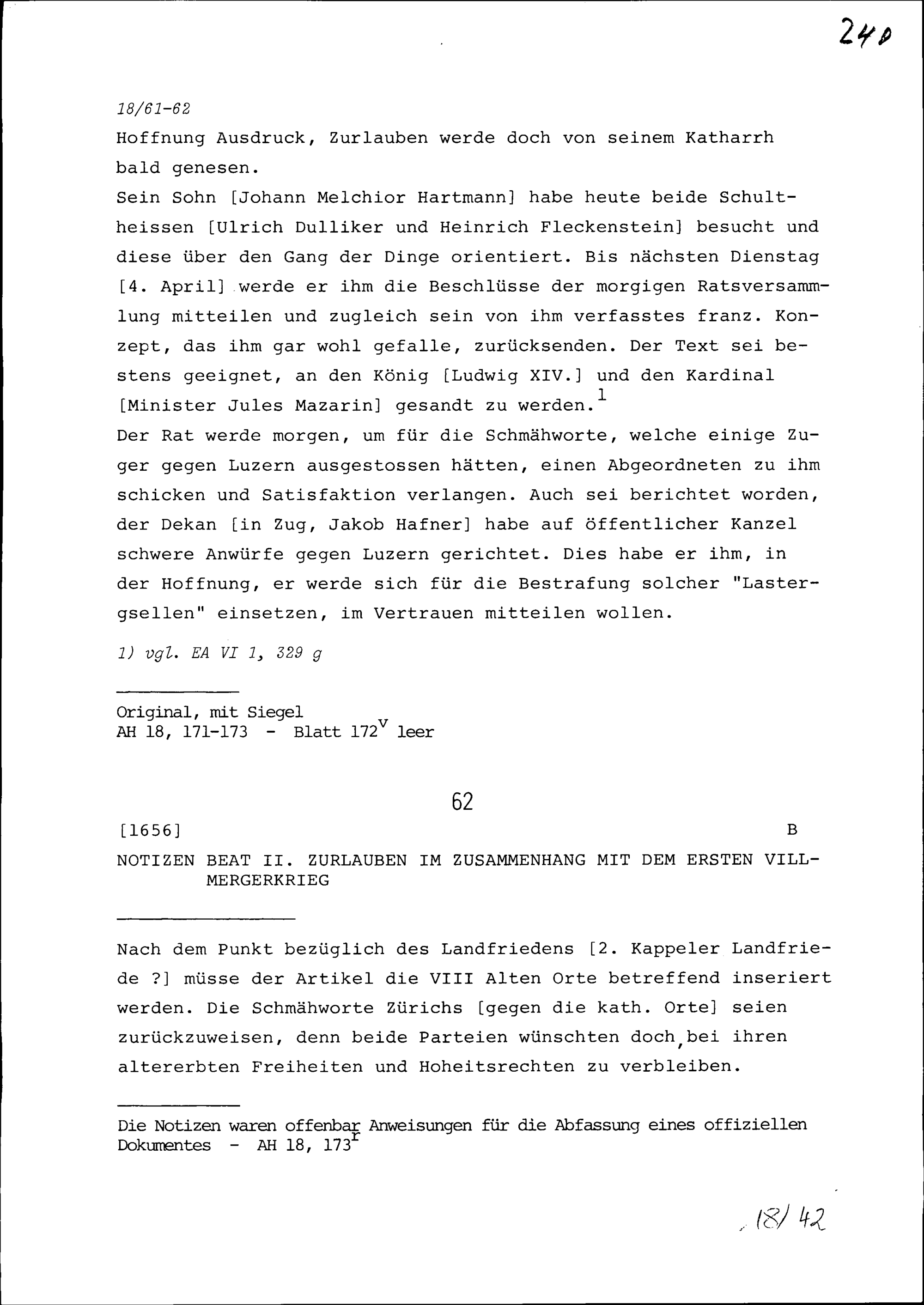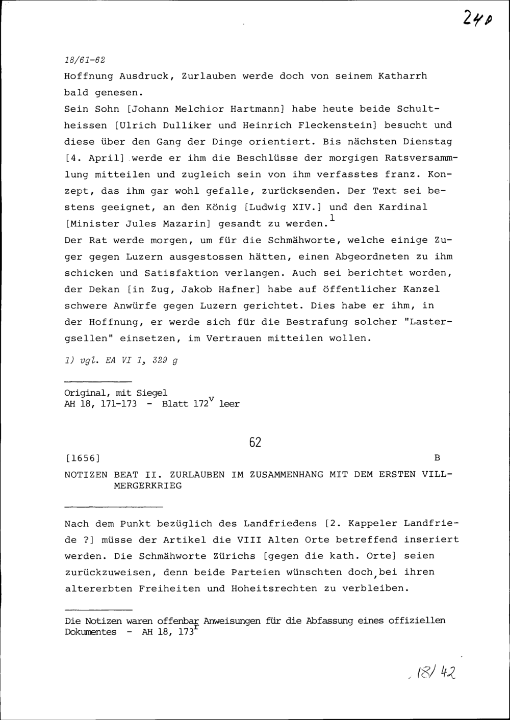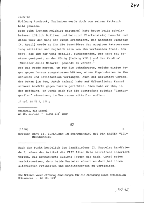 Notiz von Beat II. Zurlauben in Zusammenhang mit dem ersten Villmergerkrieg