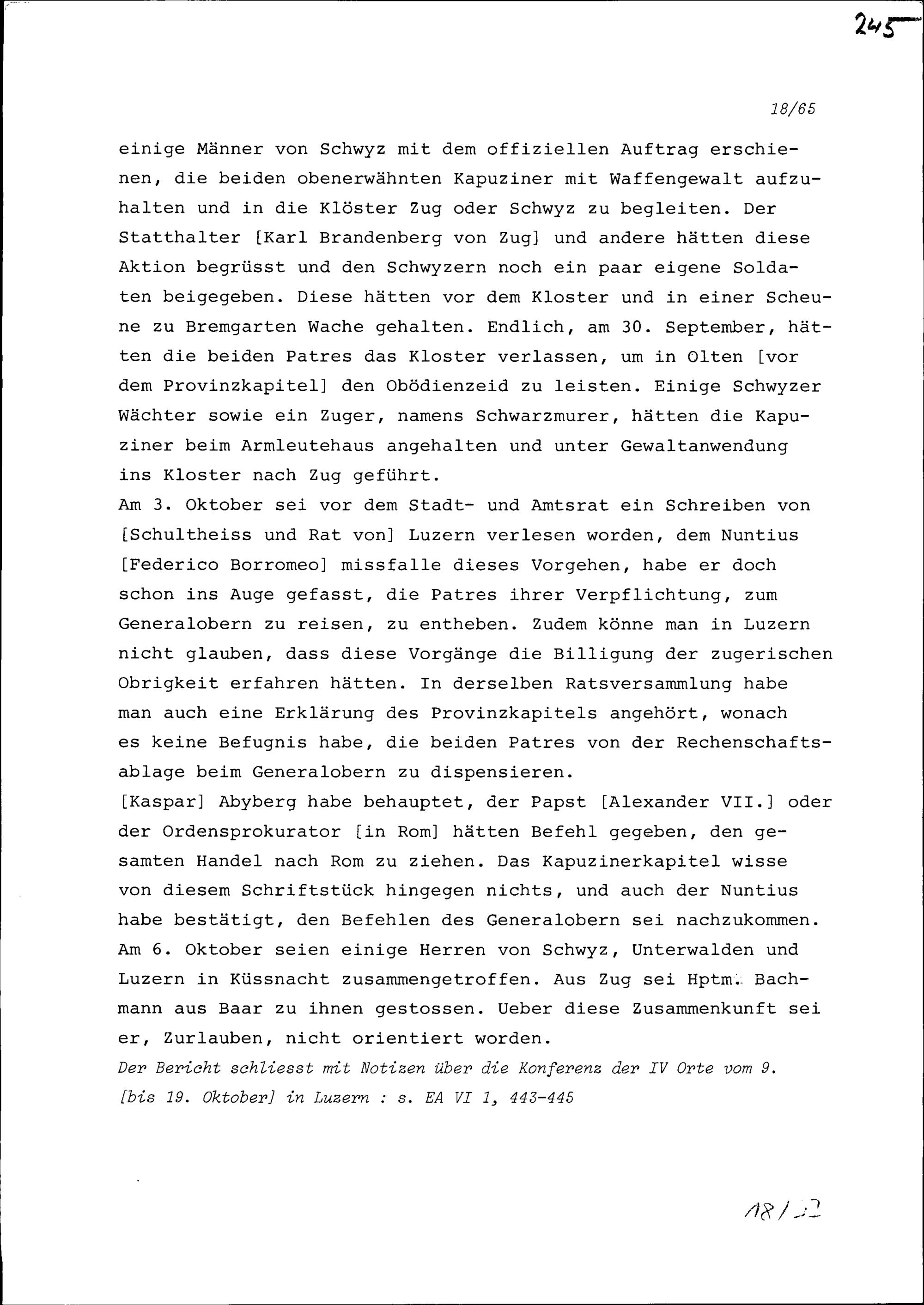 Notiz von Beat II. Zurlauben über die Verhandlungen zur Beilegung des Zwyerhandels