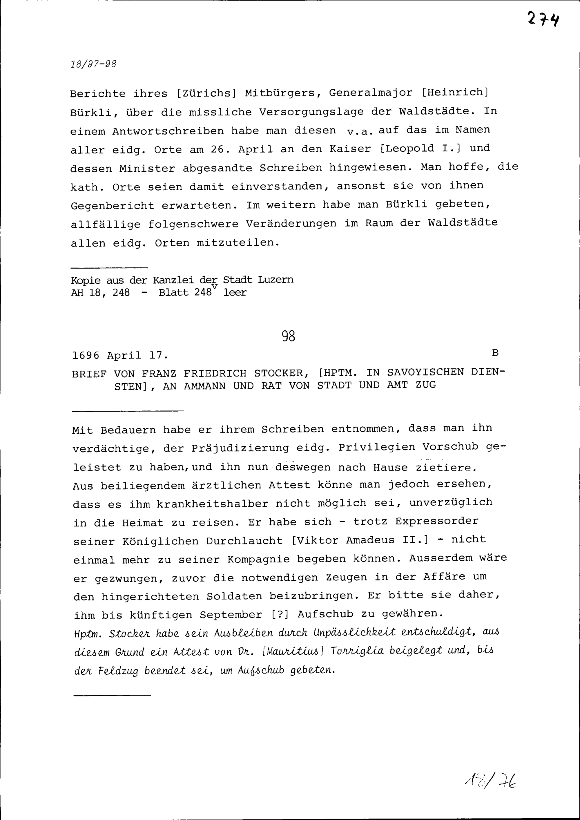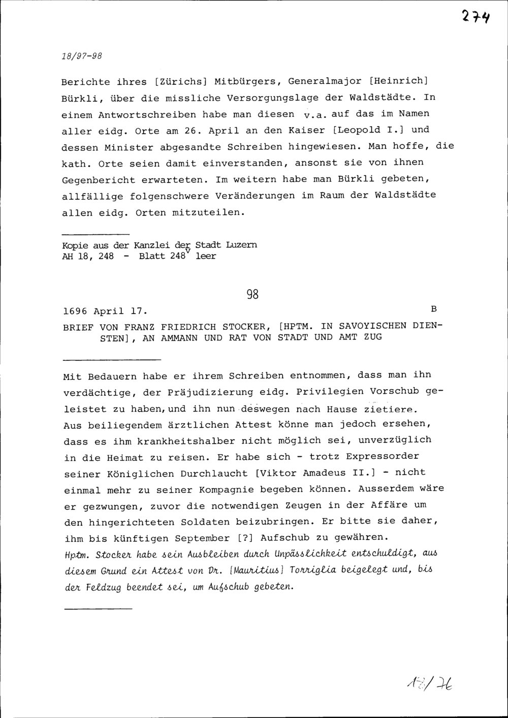 Schreiben von Franz Friedrich Stocker, Hauptmann in savoyischen Diensten, an Ammann...
