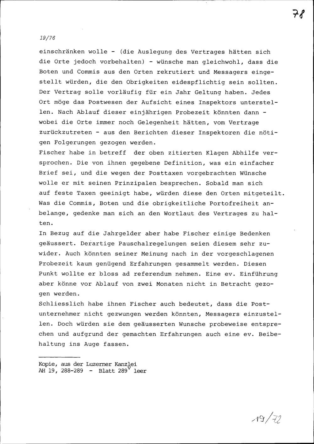Verhandlungen der Fünf Katholischen Orte mit Johann Kaspar von Muralt, Postunternehmer, und mit Beat Fischer von Reichenbach, Postunternehmer