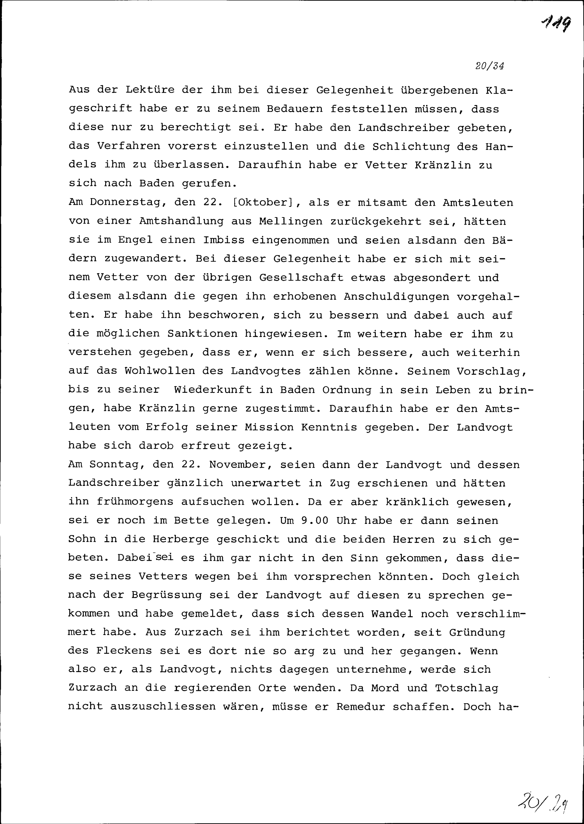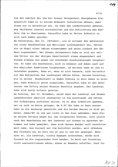 Notiz von Konrad III. Zurlauben über seine Bemühungen, Michael Kränzlin, Chorherr in Zurzach, zu einem besseren Lebenswandel zu bewegen und ihn mit Kaspar Graffenried, Landvogt von Baden, auszusöhnen