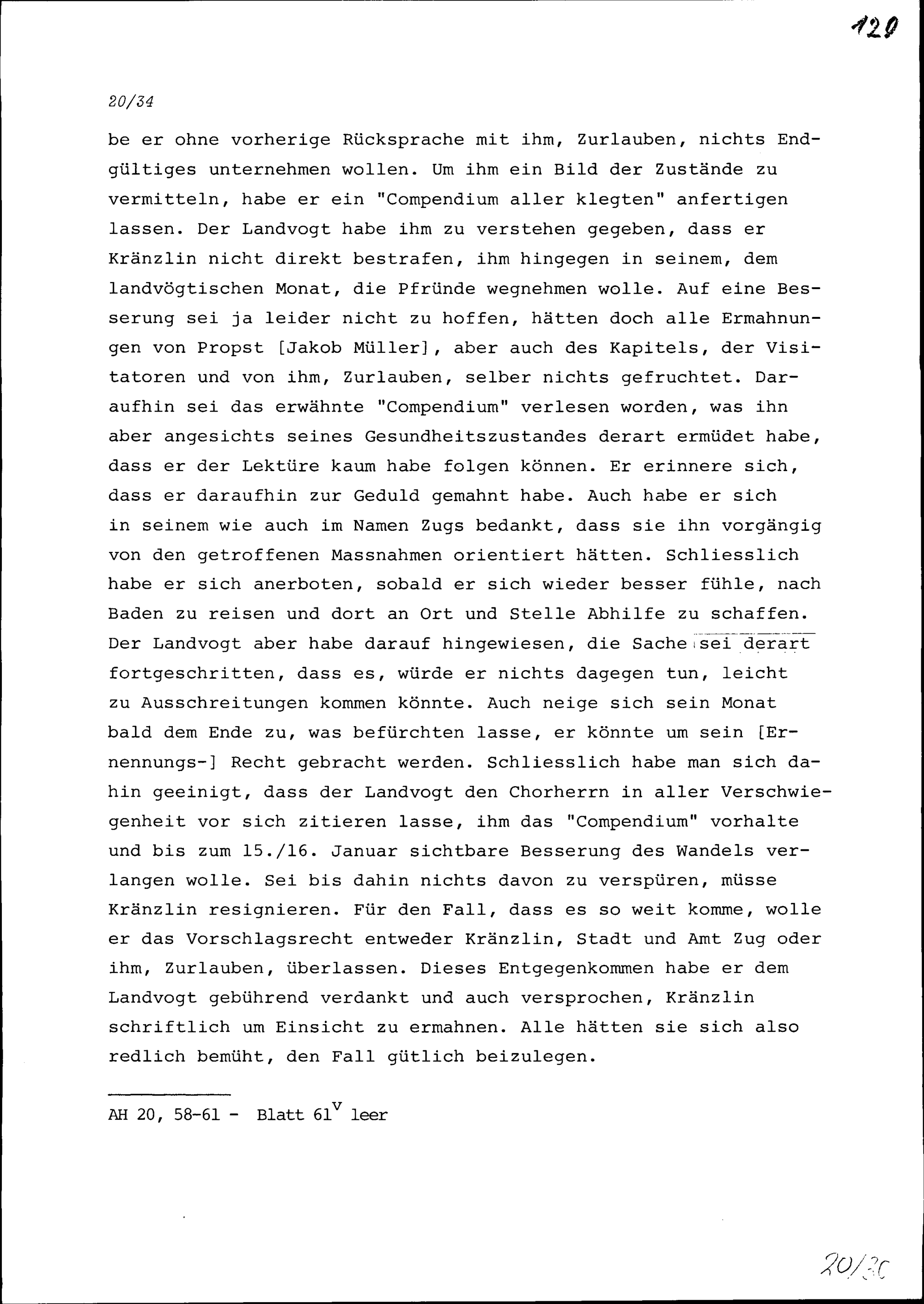 Notiz von Konrad III. Zurlauben über seine Bemühungen, Michael Kränzlin, Chorherr in Zurzach, zu einem besseren Lebenswandel zu bewegen und ihn mit Kaspar Graffenried, Landvogt von Baden, auszusöhnen
