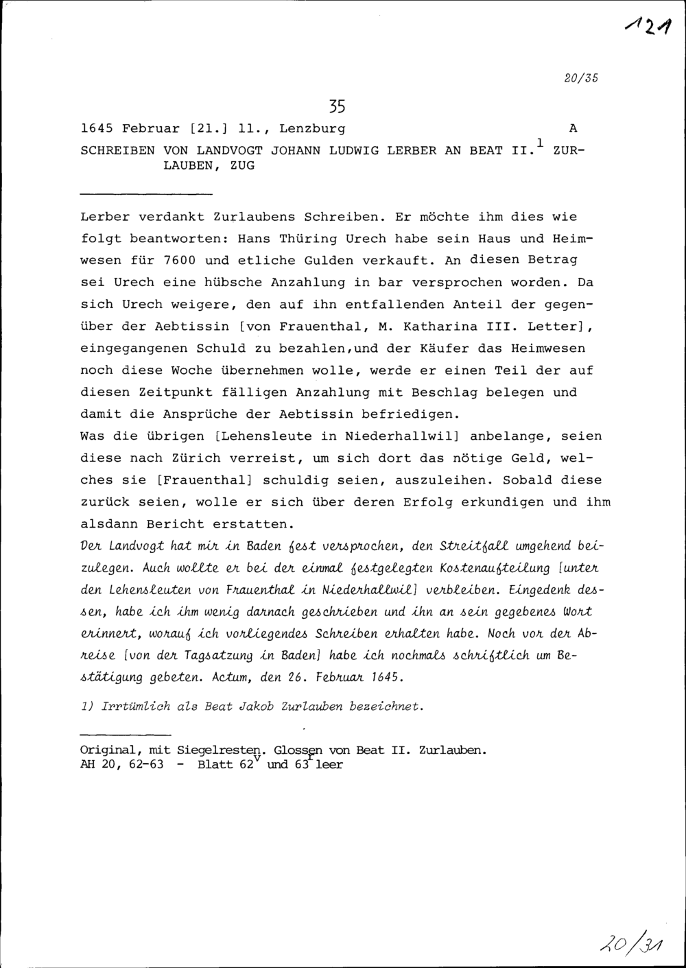 Schreiben von Johann Ludwig Lerber, Landvogt, an Beat II. Zurlauben, Zug