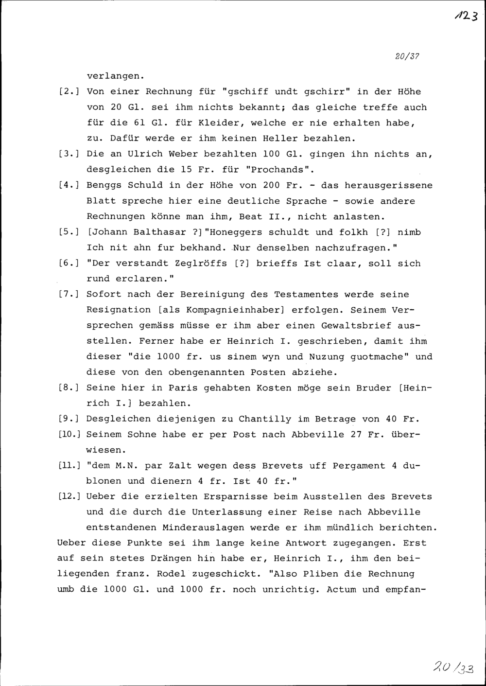 Bericht von Beat II. Zurlauben zuhanden von Heinrich I. Zurlauben wegen der übersandten Rechnung der Kompanie Zurlauben