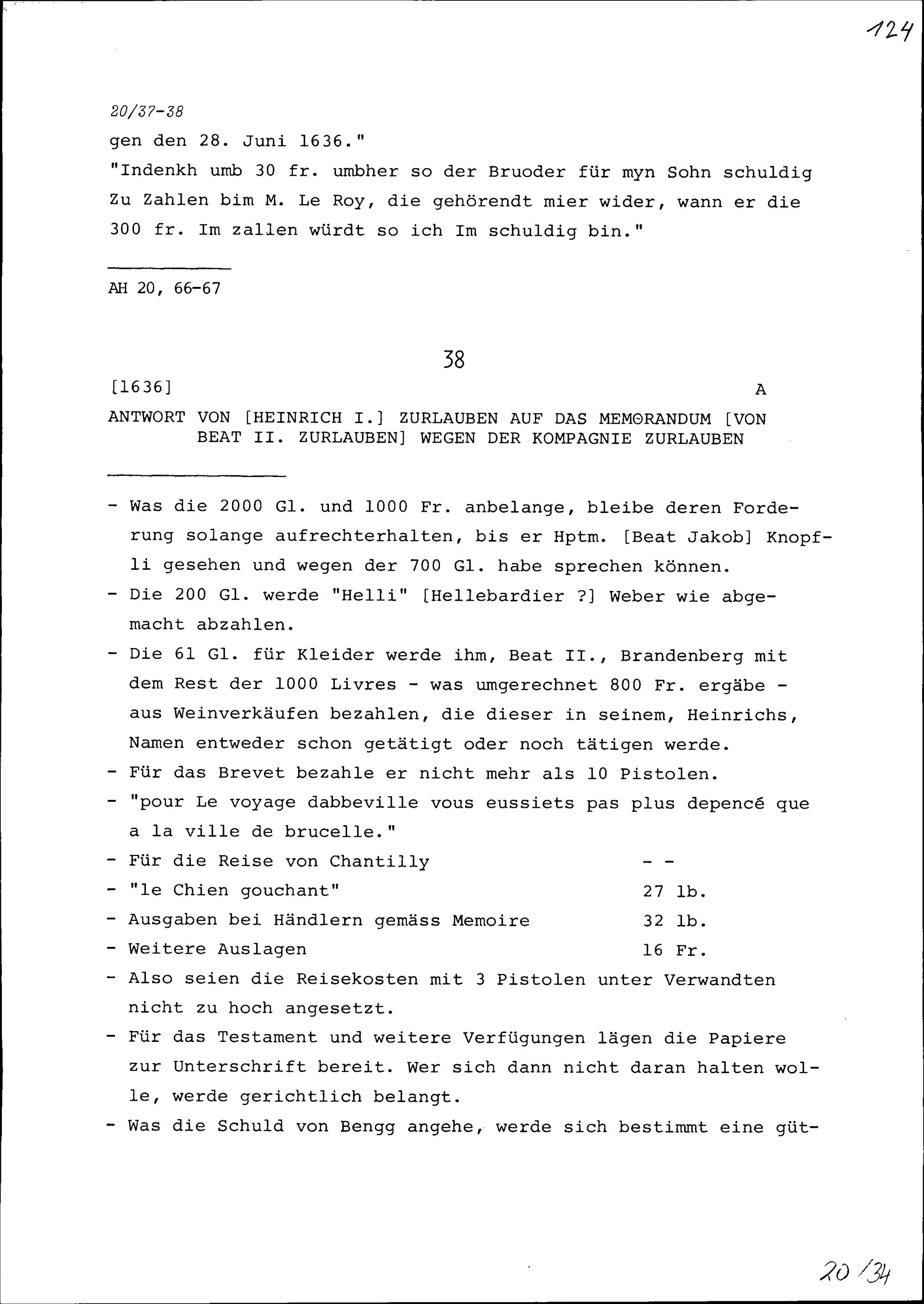 Antwort von Heinrich I. Zurlauben auf das Memorandum von Beat II. Zurlauben wegen der Kompanie Zurlauben