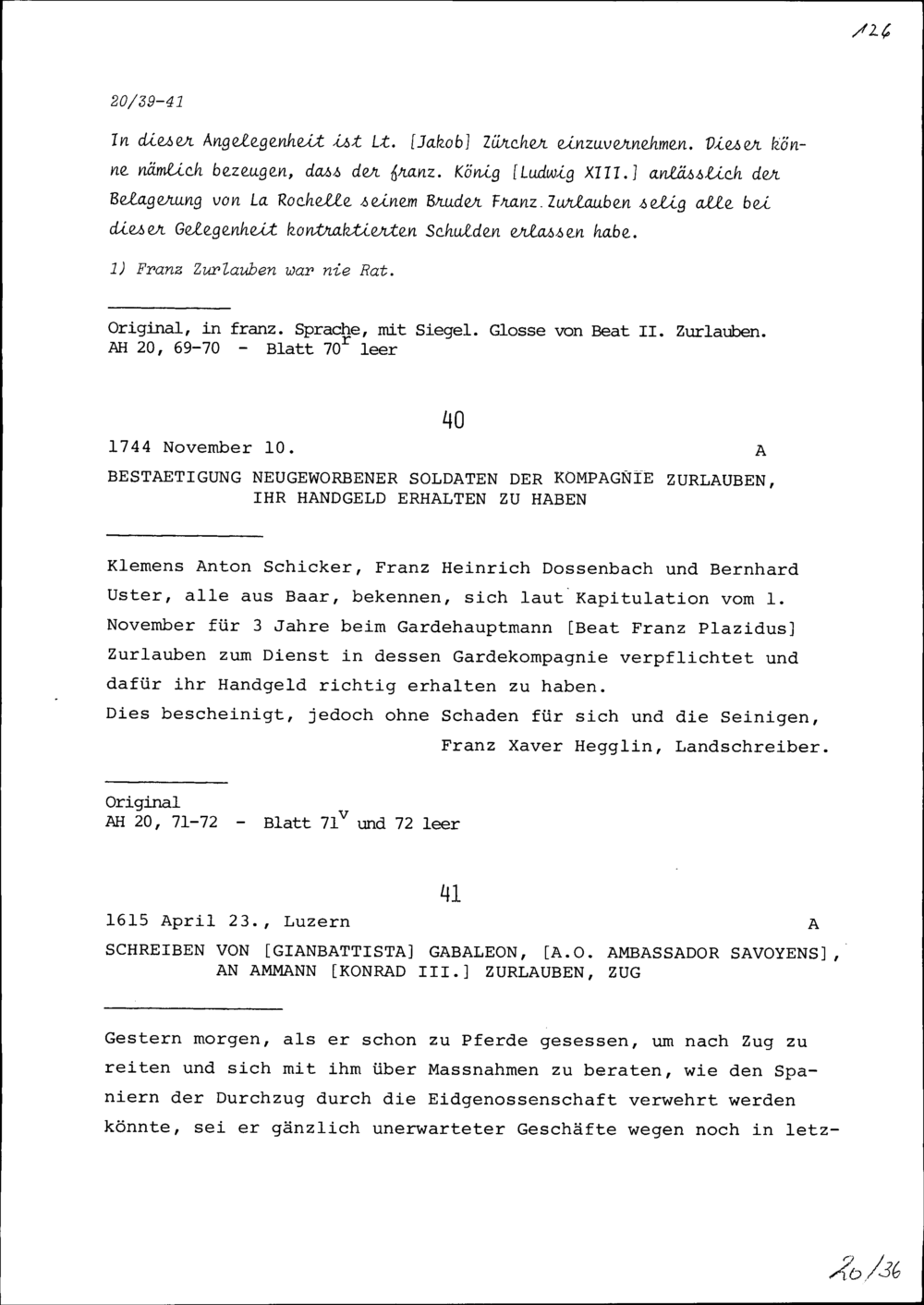 Bestätigung neugeworbener Soldaten der Kompanie Zurlauben, ihr Handgeld erhalten...
