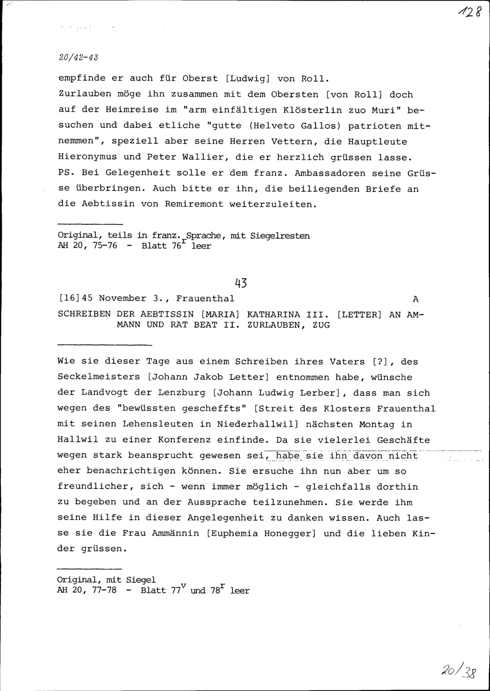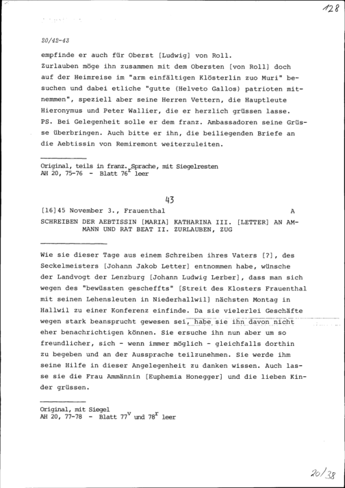 Schreiben von Maria Katharina III. Letter, Äbtissin, an Beat II. Zurlauben, Ammann...