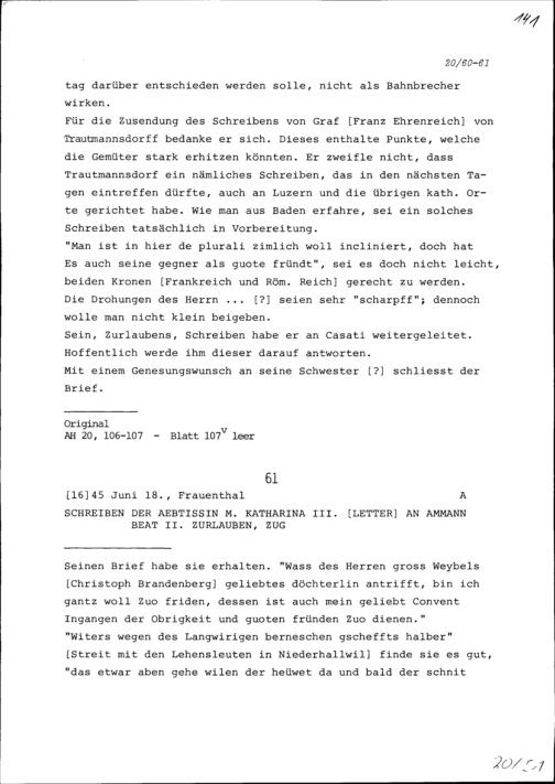 Schreiben von Maria Katharina III. Letter, Äbtissin, an Beat II. Zurlauben, Ammann, Zug