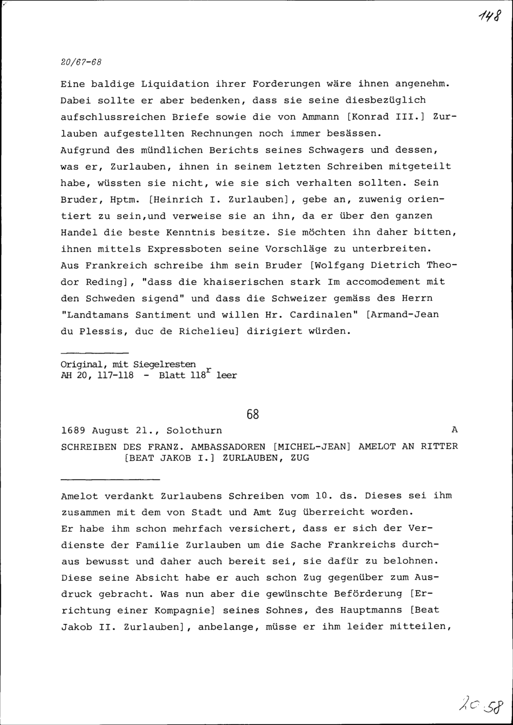 Schreiben von Michel-Jean Amelot, Ambassador von Frankreich, an Beat Jakob I. Zurlauben, Zug