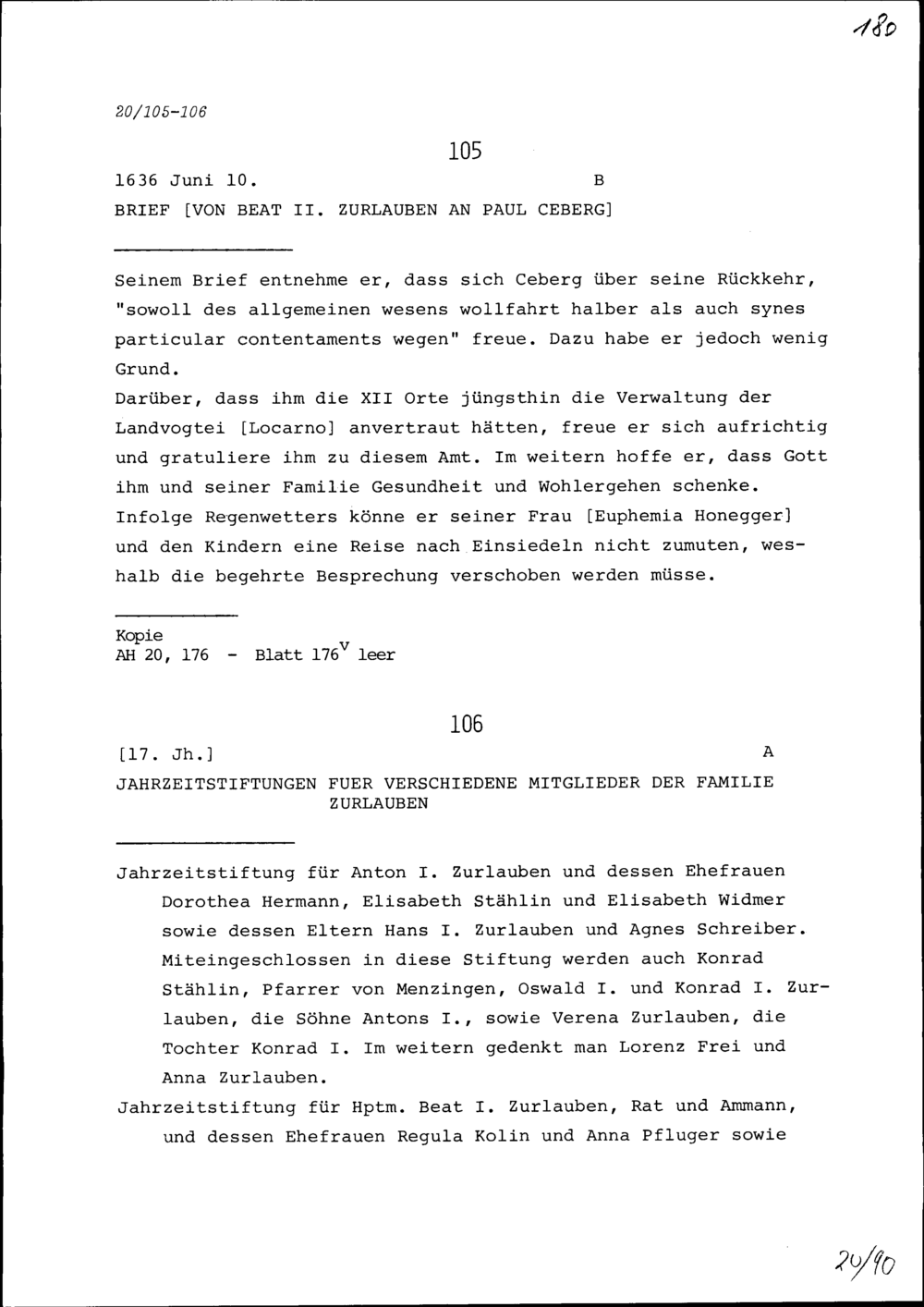 Schreiben von Beat II. Zurlauben an Paul Ceberg