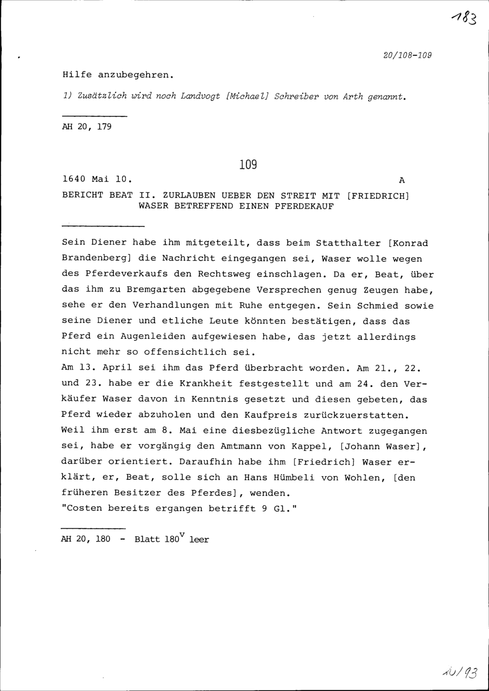 Bericht von Beat II. Zurlauben über den Streit mit Friedrich Waser betreffend einen Pferdekauf