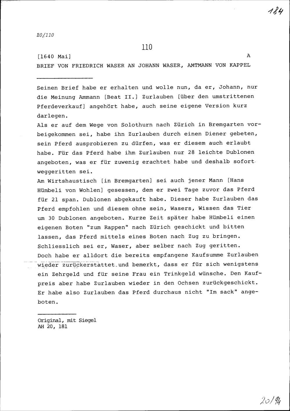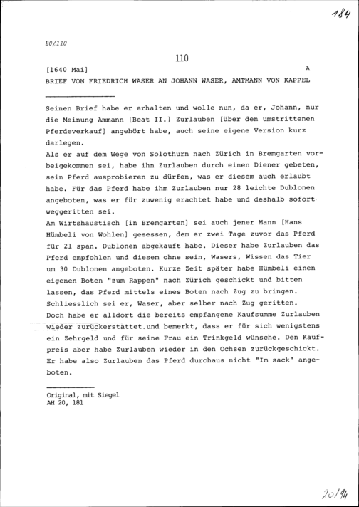Schreiben von Friedrich Waser an Johann Waser, Amtmann von Kappel
