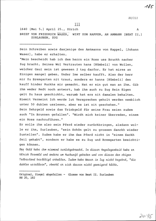 Schreiben von Friedrich Waser, Wirt zum Rappen, an Beat II. Zurlauben, Ammann, Z...