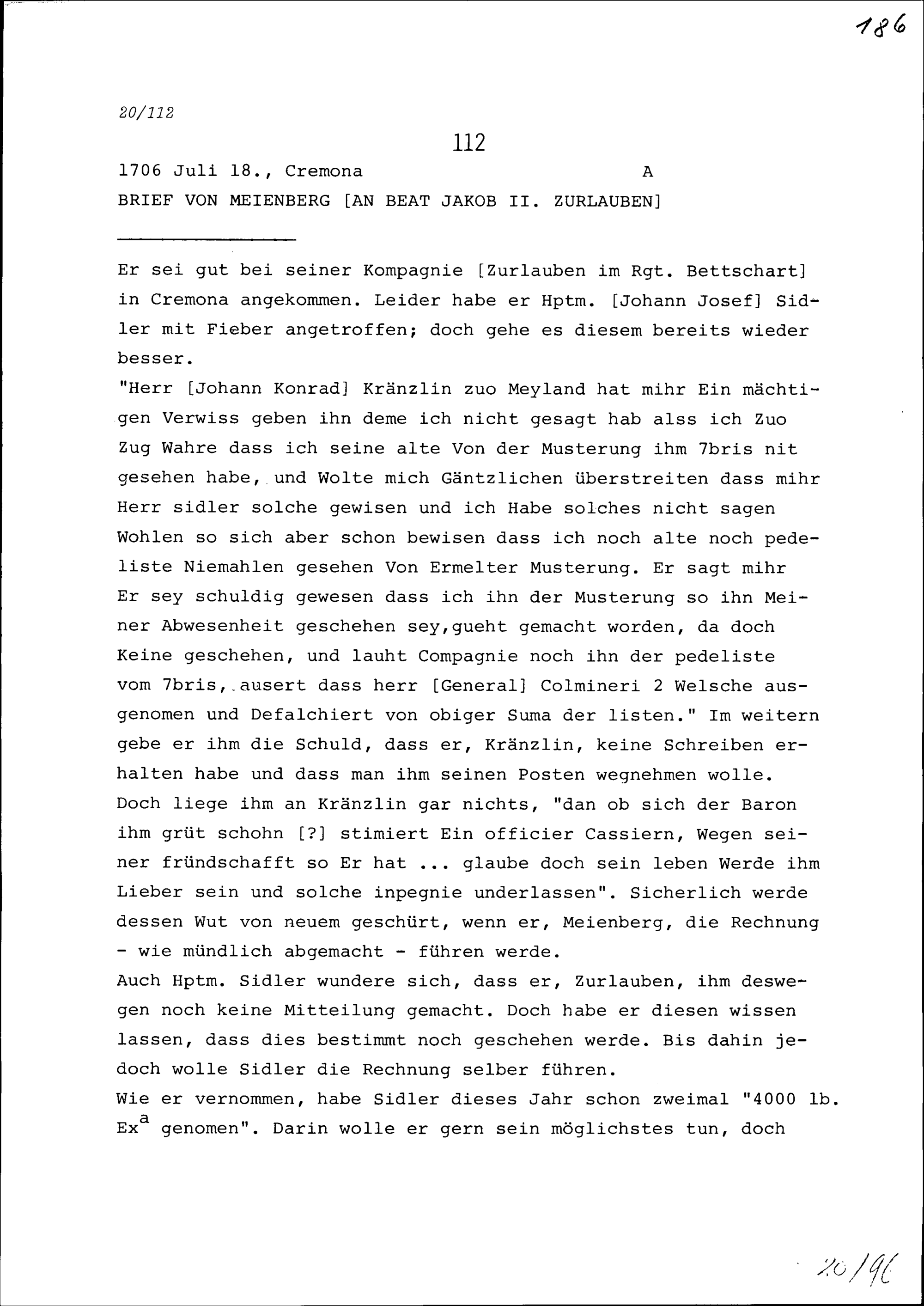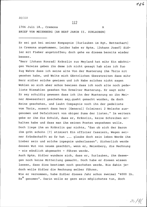 Schreiben von Meienberg an Beat Jakob II. Zurlauben