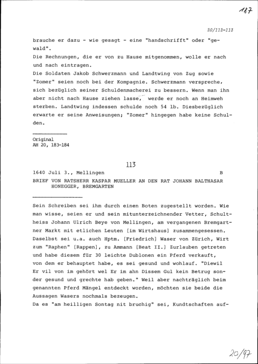 Schreiben von Kaspar Müller, Ratsherr, an Johann Balthasar Honegger, Rat, Bremgarten