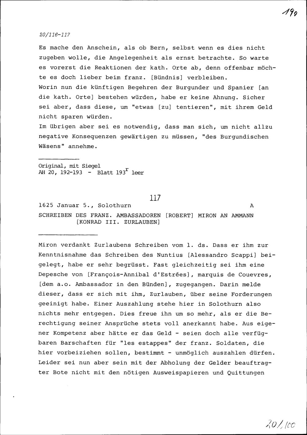 Schreiben von Robert Miron, Ambassador von Frankreich, an Konrad III. Zurlauben,...