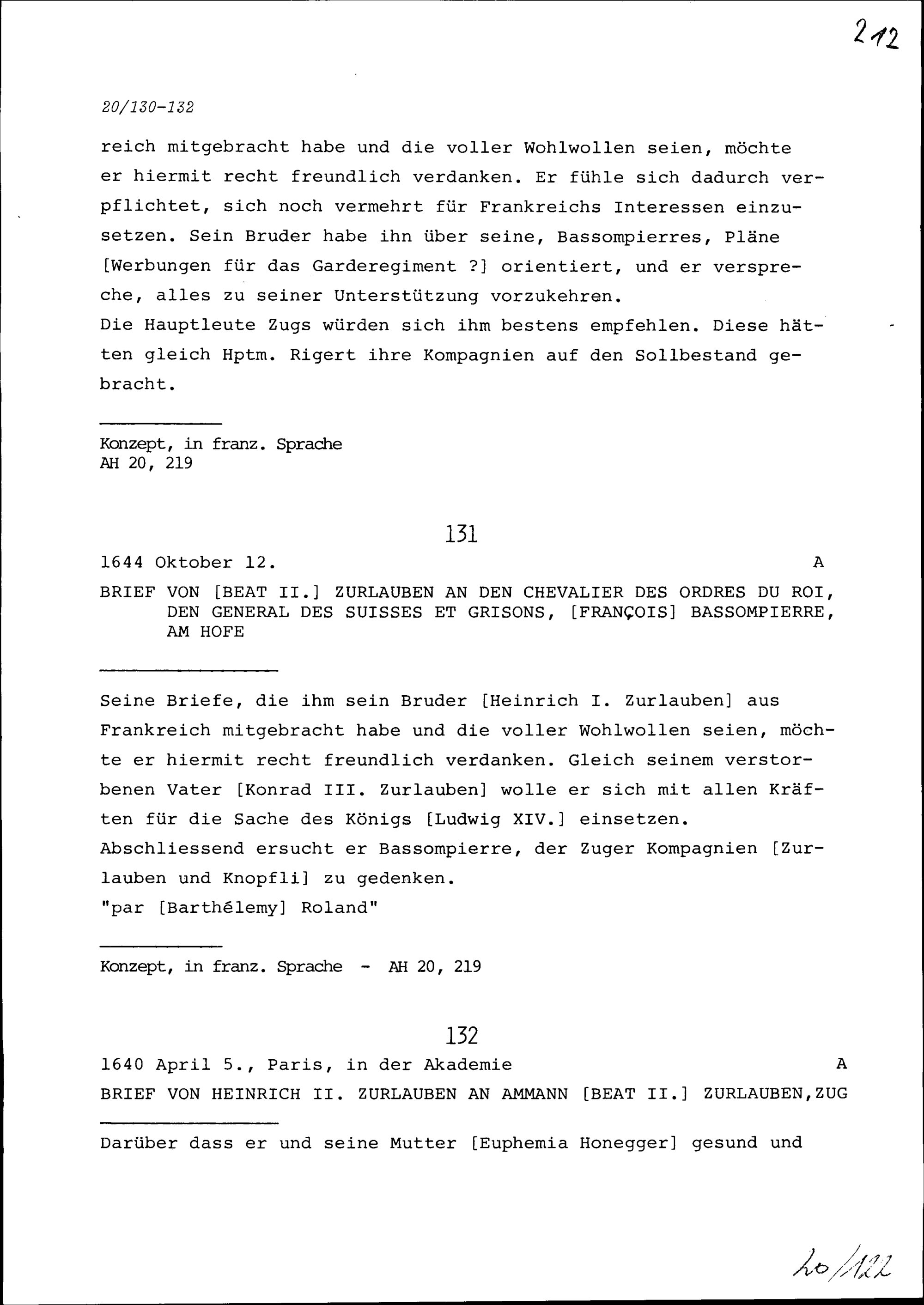 Schreiben von Beat II. Zurlauben an François de Bassompierre, Kommandant des Regiments der Schweizer und Bündner Garden, am Hofe