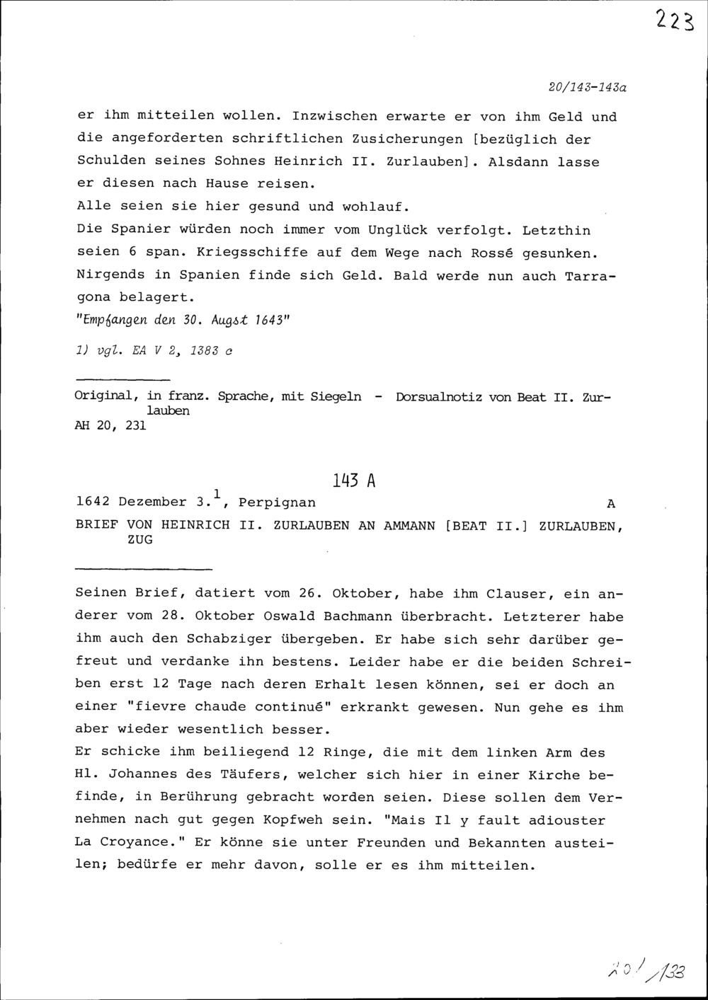 Schreiben von Heinrich II. Zurlauben an Beat II. Zurlauben, Ammann, Zug