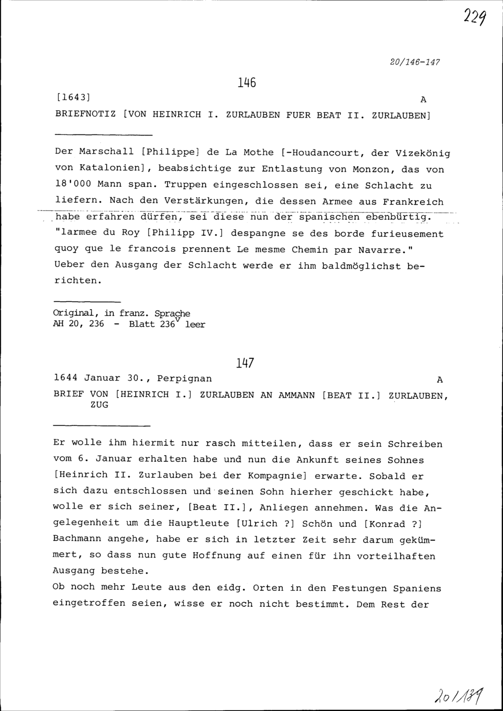 Briefnotiz von Heinrich I. Zurlauben für Beat II. Zurlauben