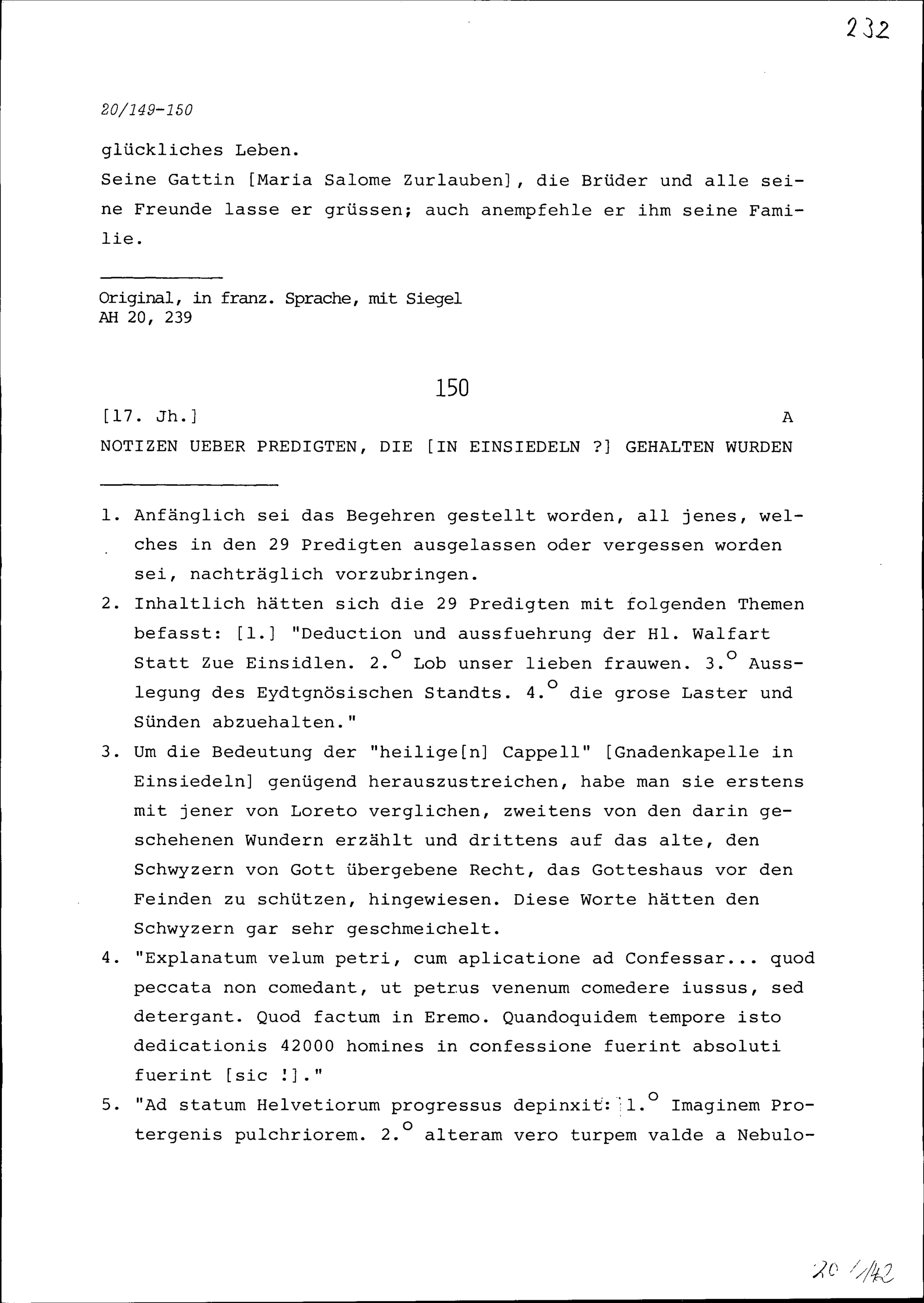 Notiz über Predigten, die in Einsiedeln gehalten wurden
