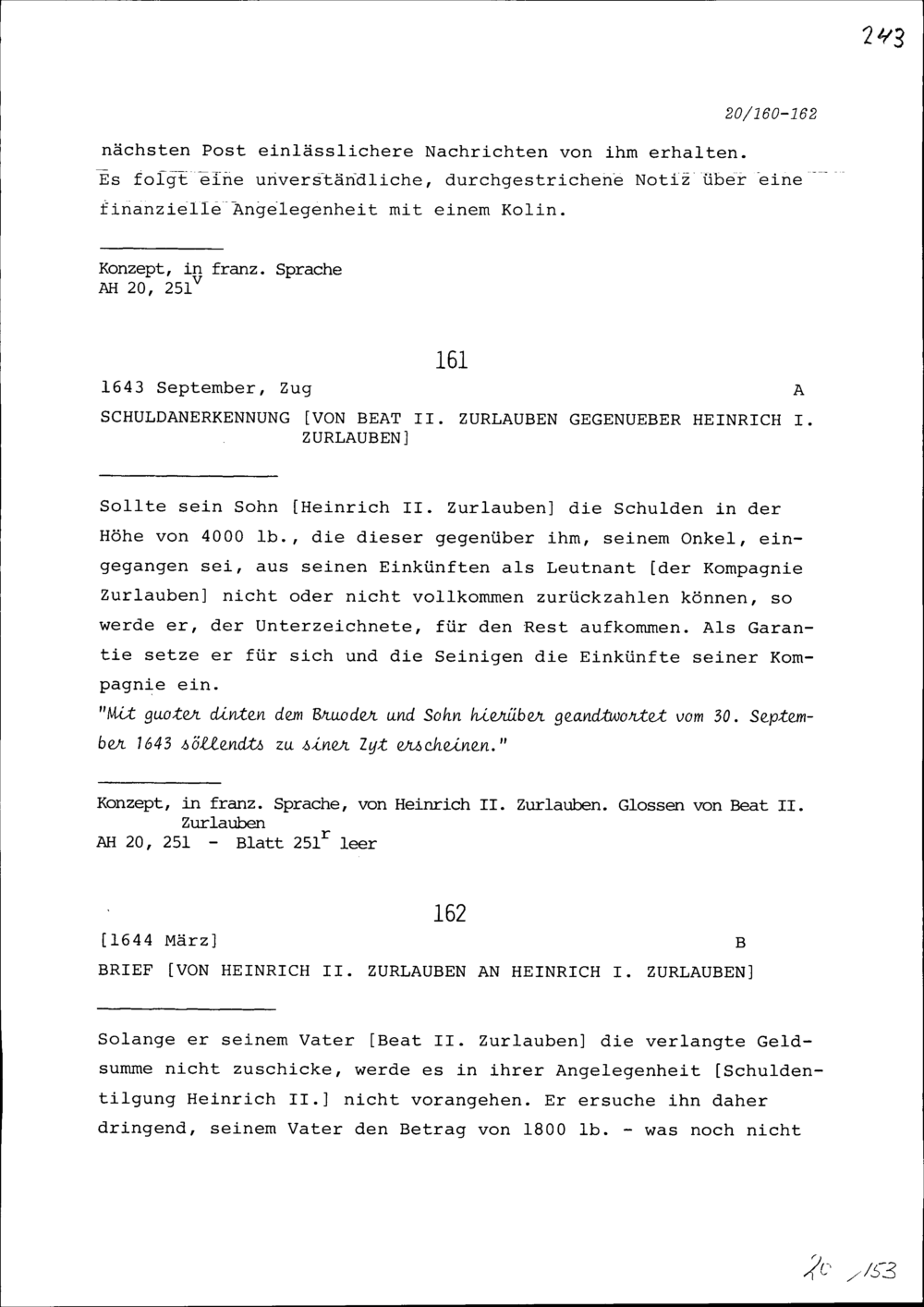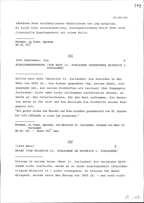 Schuldanerkennung von Beat II. Zurlauben gegenüber Heinrich I. Zurlauben