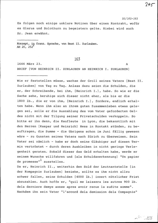 Schreiben von Heinrich II. Zurlauben an Heinrich I. Zurlauben