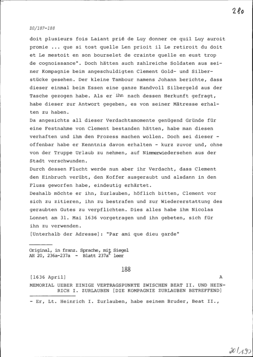 Bericht über einige Vertragspunkte zwischen Beat II. Zurlauben und Heinrich I. Zurlauben, die Kompanie Zurlauben betreffend