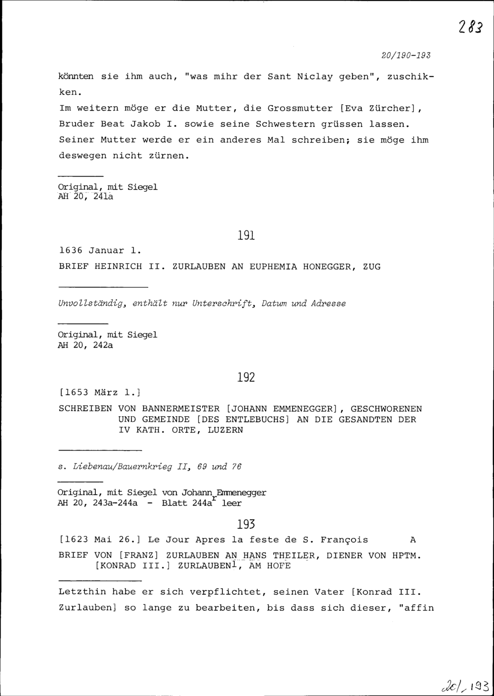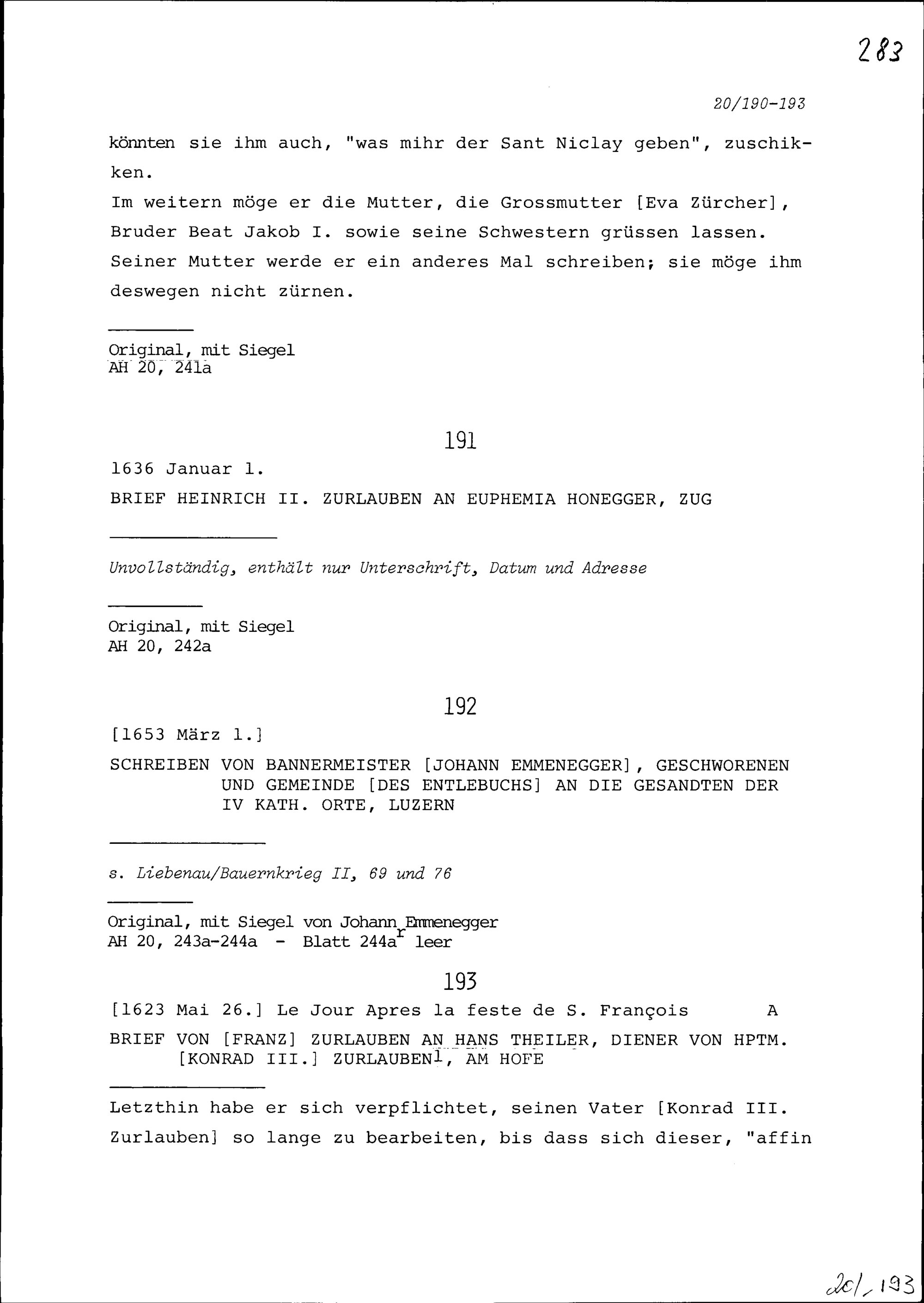 Schreiben von Heinrich II. Zurlauben an Euphemia Honegger, Zug