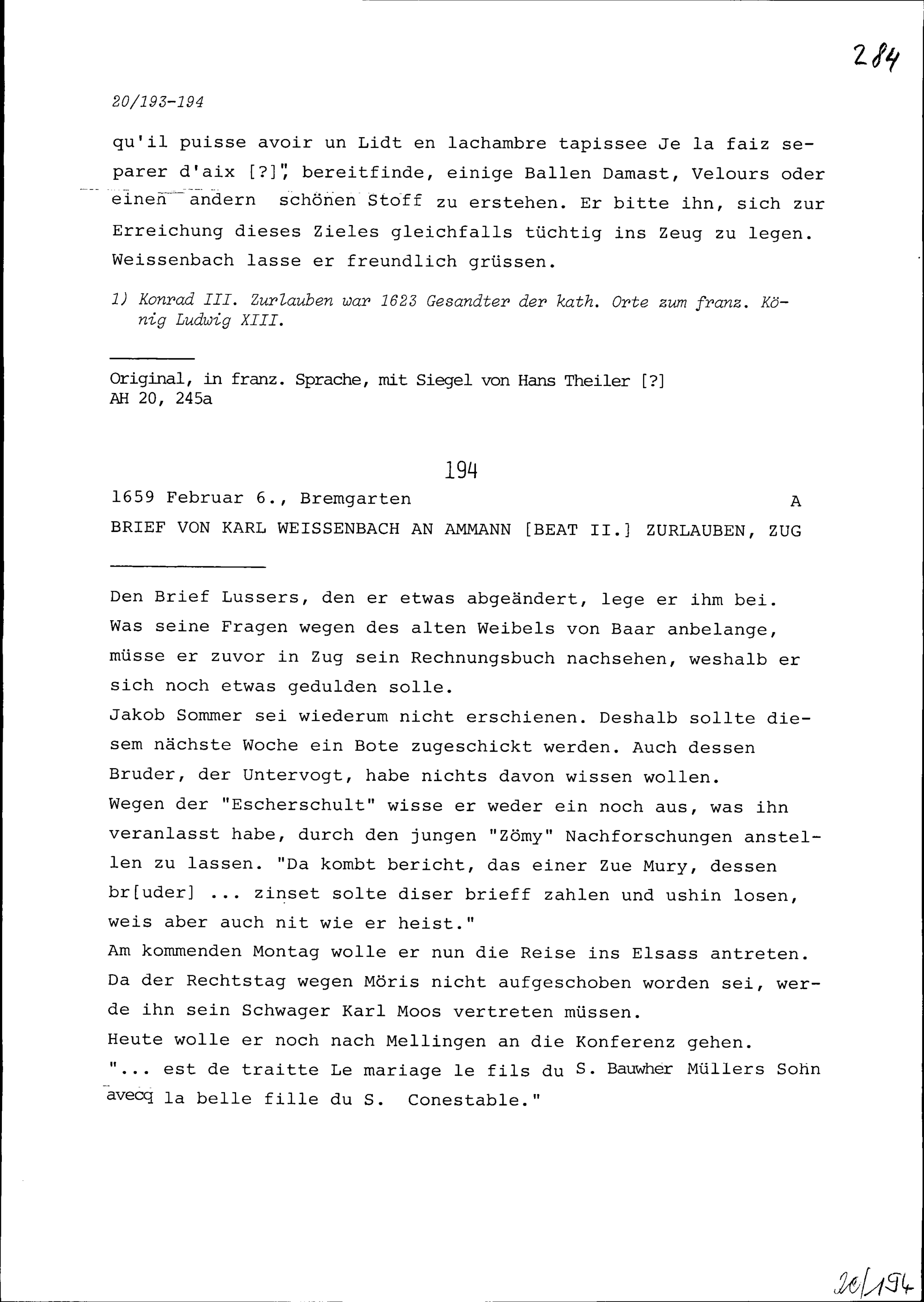 Schreiben von Karl Weissenbach an Beat II. Zurlauben, Ammann, Zug