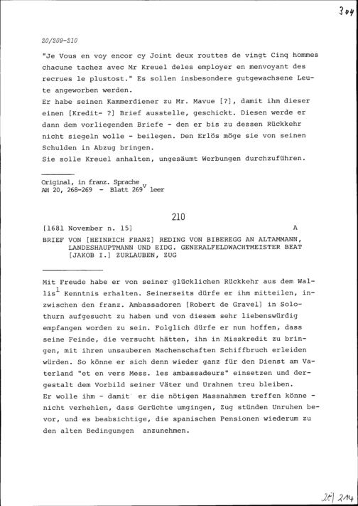 Schreiben von Heinrich Franz Reding von Biberegg an Beat Jakob I. Zurlauben, Altammann, Landeshauptmann und eidgenössischen Generalfeldwachtmeister, Zug