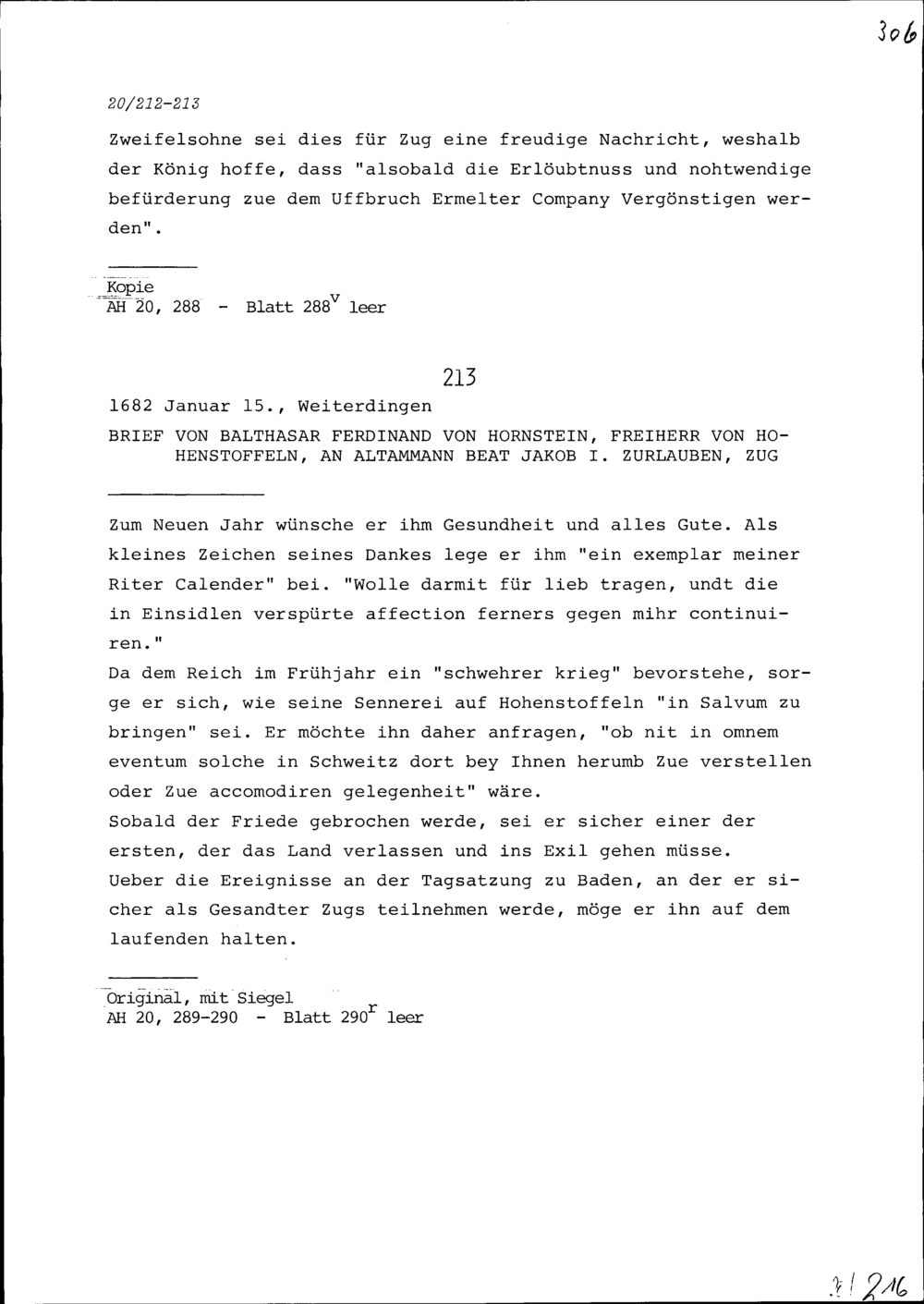 Schreiben von Balthasar Ferdinand von Hornstein, Freiherr von Hohenstoffeln, an Beat Jakob I. Zurlauben, Altammann, Zug